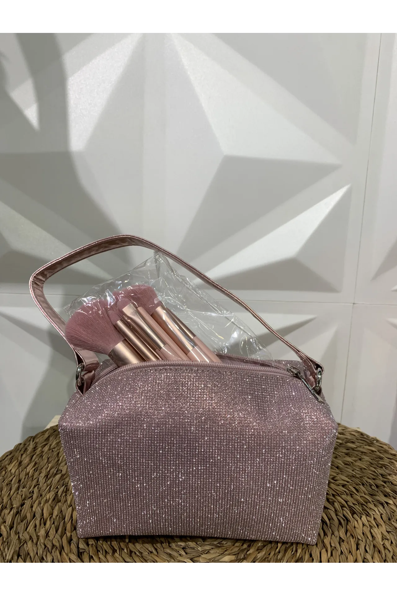 Neceser de purpurina con pack de brochas en el interior de 10 brochas en rosa.