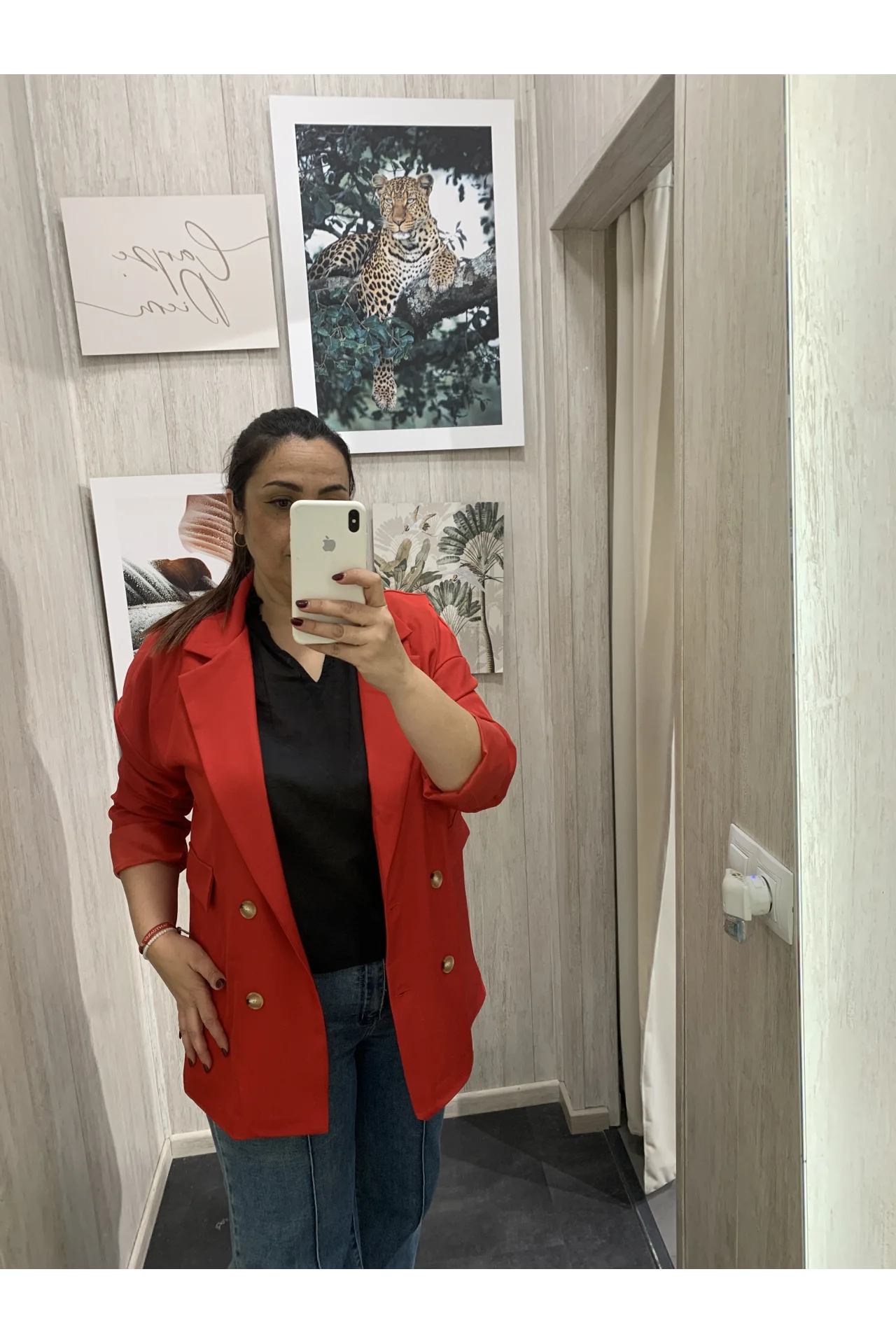 Blazer amplia de cuello solapa y manga midi. Bolsillos delanteros con solapa. Cierre frontal cruzado con botones.