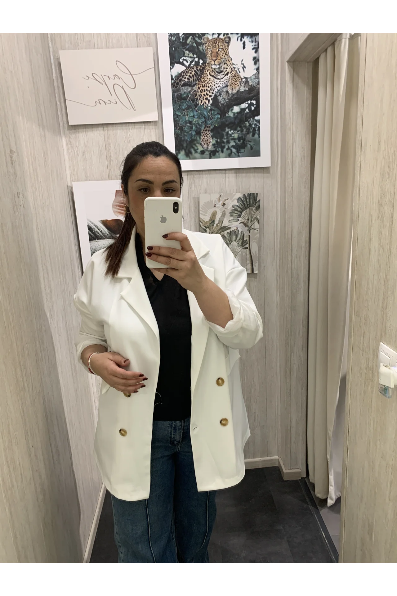 Blazer amplia de cuello solapa y manga midi. Bolsillos delanteros con solapa. Cierre frontal cruzado con botones.