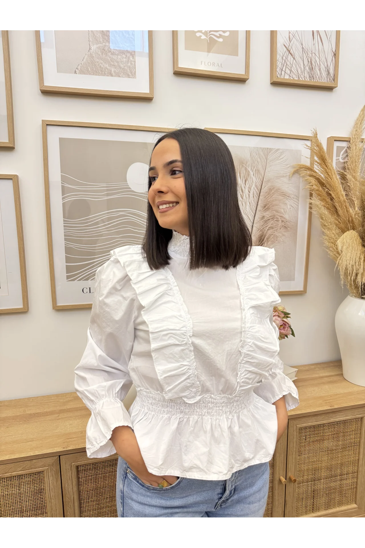 Camisa con cuello soft, con detalle de volante en pico en la parte delantera y puño terminado en volante.