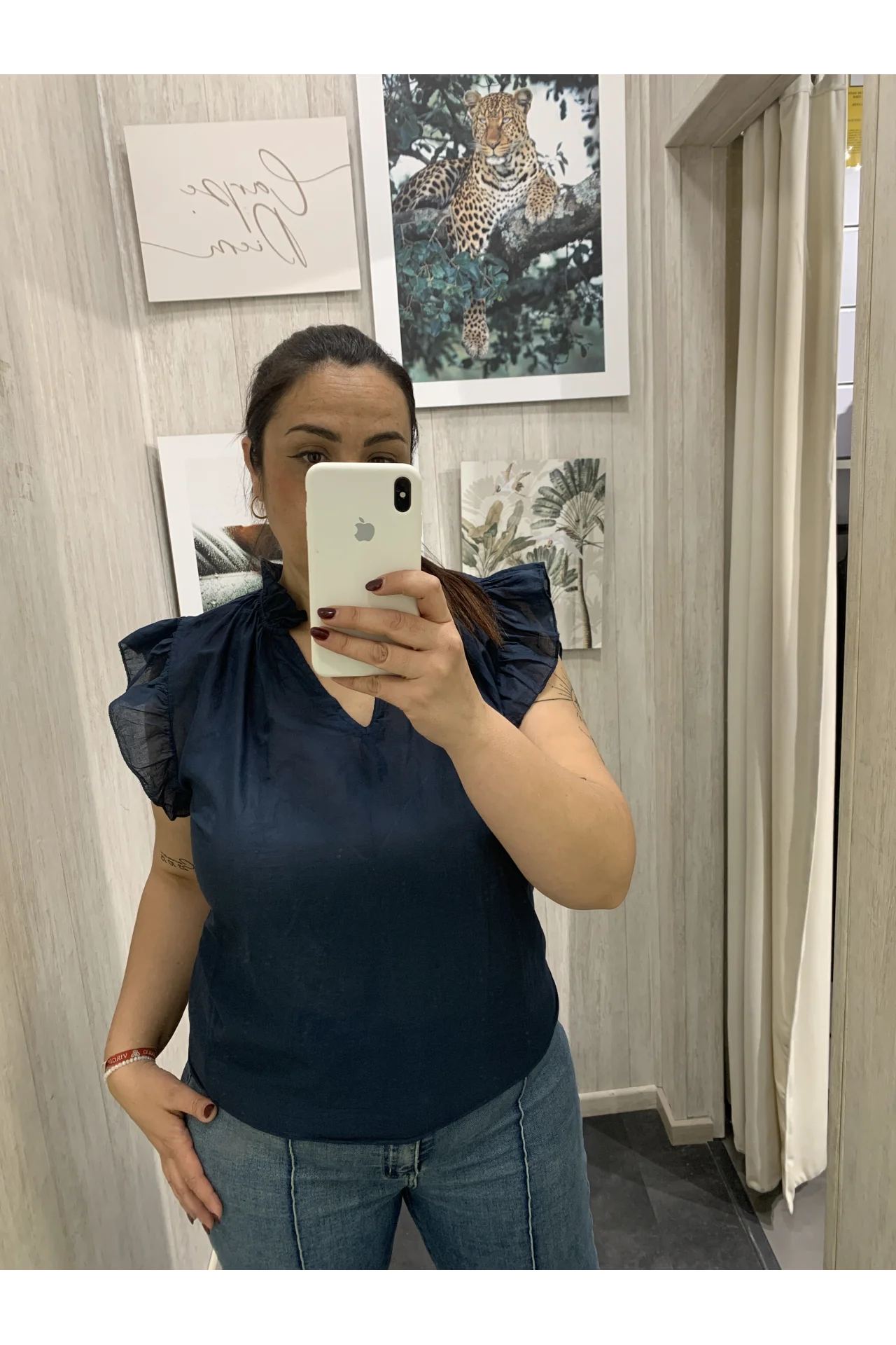 Blusa de gasa con detalle de volante en el hombre y escote de pico.