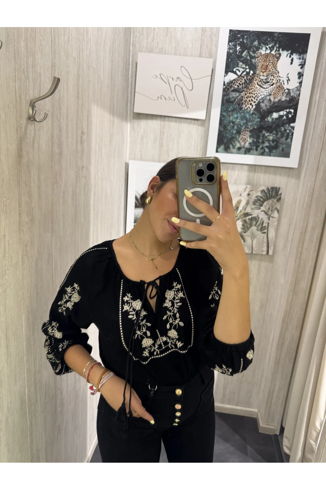 Blusa de tejido de bambula con flores bordadas en dora en la zona de la manga y escote. Cuello redondo y lazada con cordón a tono. Manga acabada en puño.