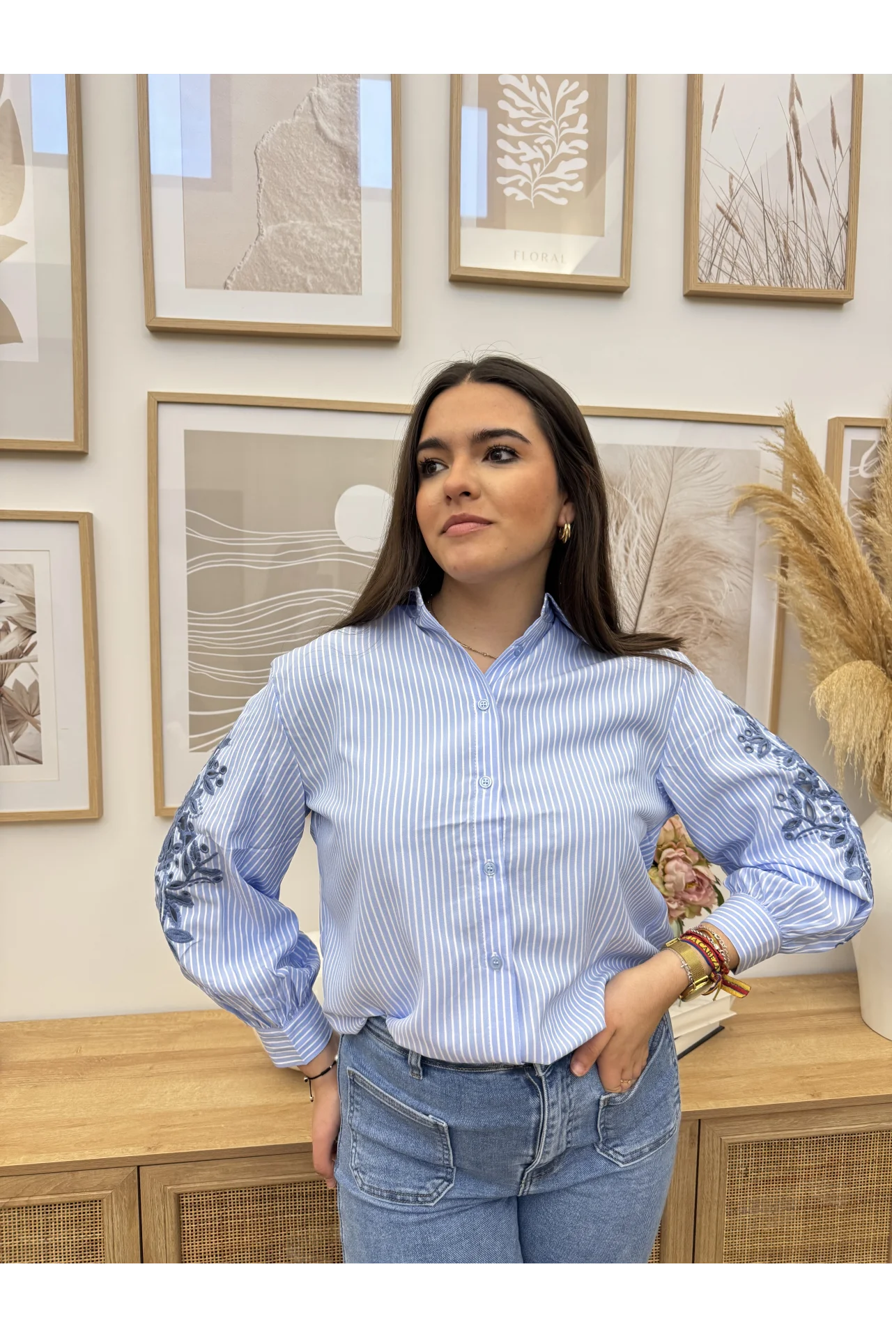 Camisa rayas finas. Cuello con solapa y manga larga. Cierre con botones. Detalle de bordado en las mangas.