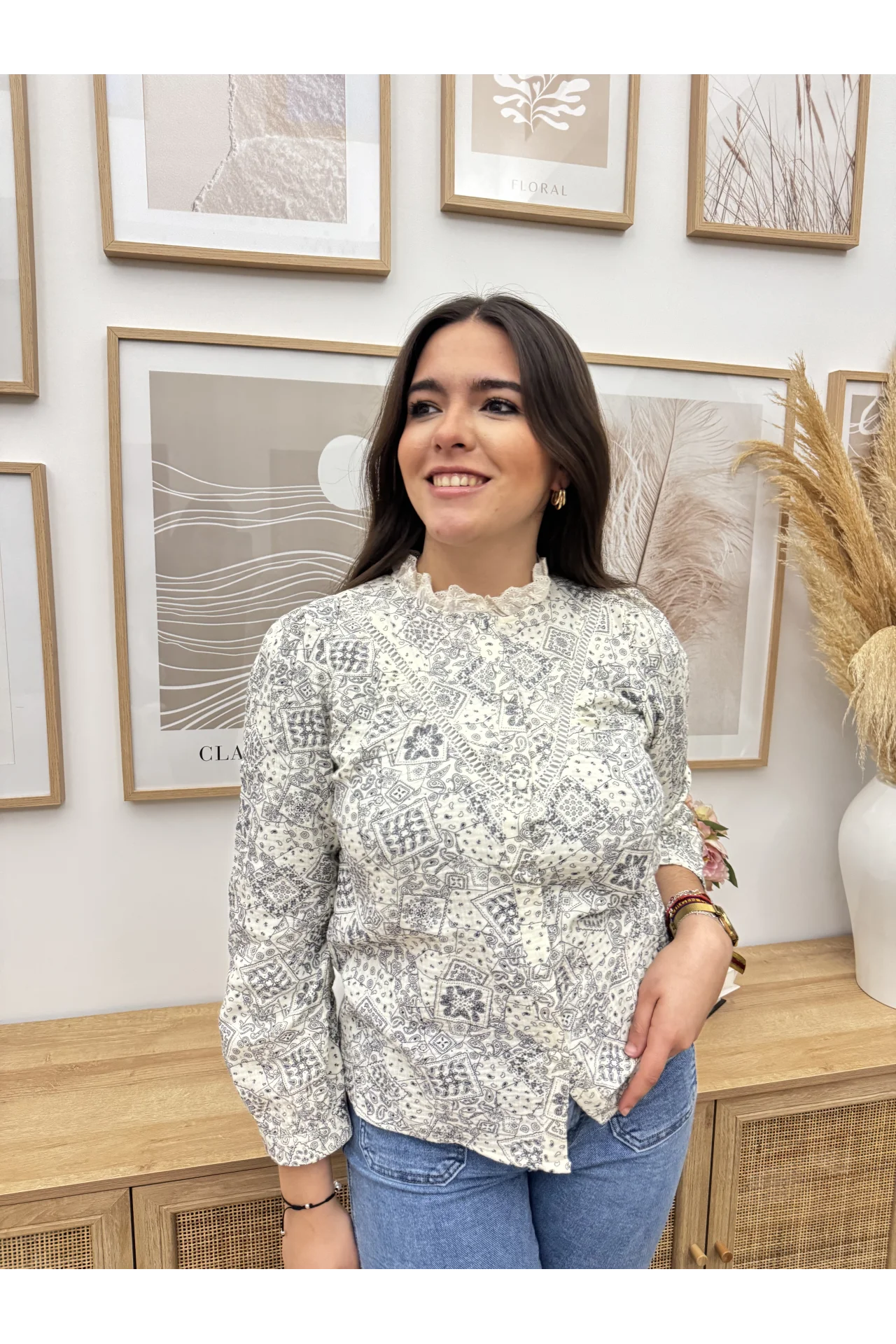 Camisa de tejido de algodón. Cuello mao con detalle de volante. Detalle de tira calada en pico en la zona delantera. Cierre con botones y manga larga.