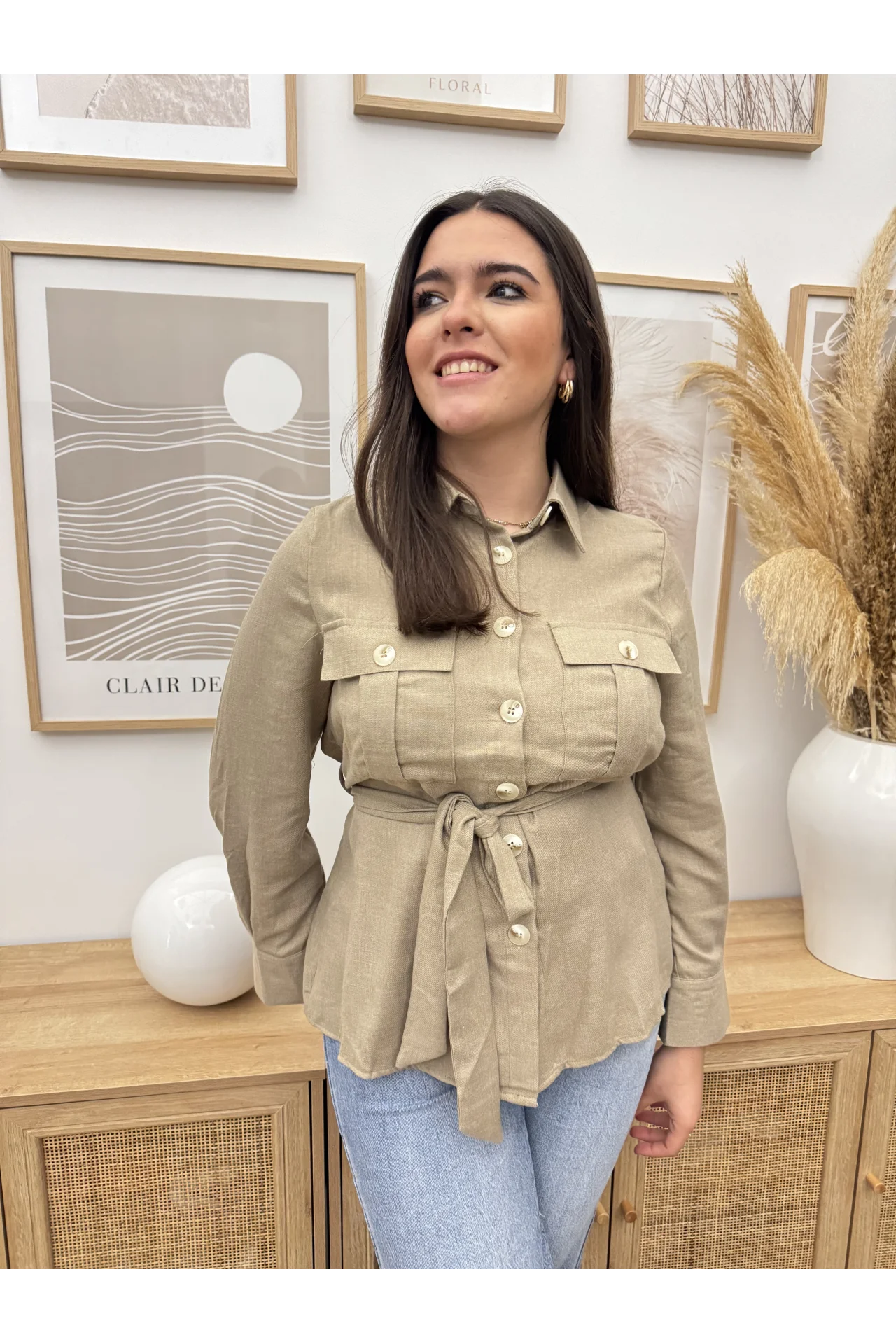 Camisa safari con cierre de botones y cinturón. Con detalle de bolsillos delanteros en la parte superior.