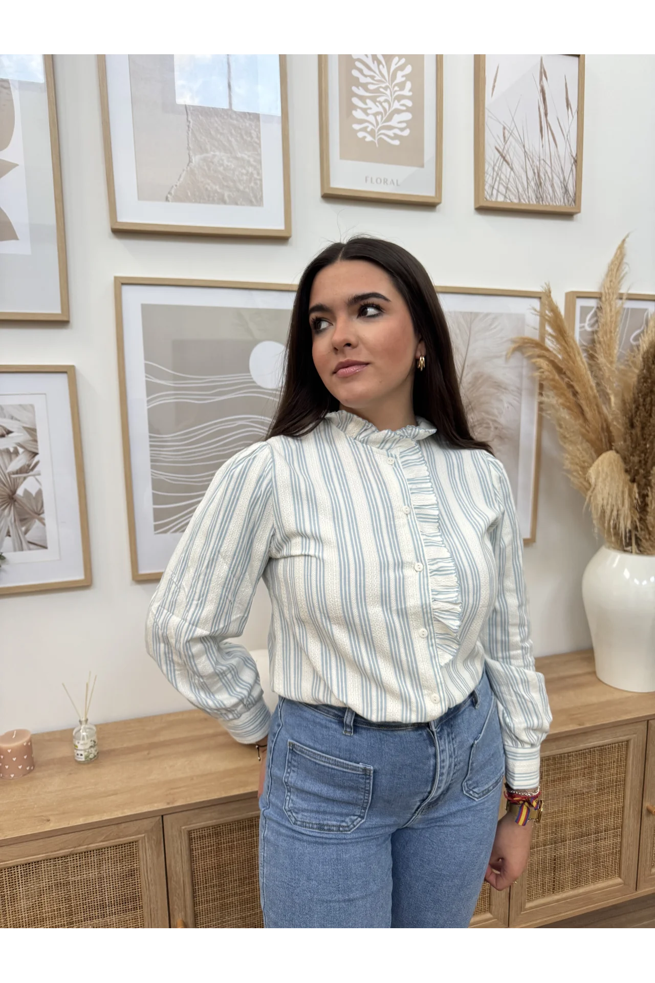 Camisa de rayas dobles con cierre de botones y detalle de volante en la parte delantero y cuello.