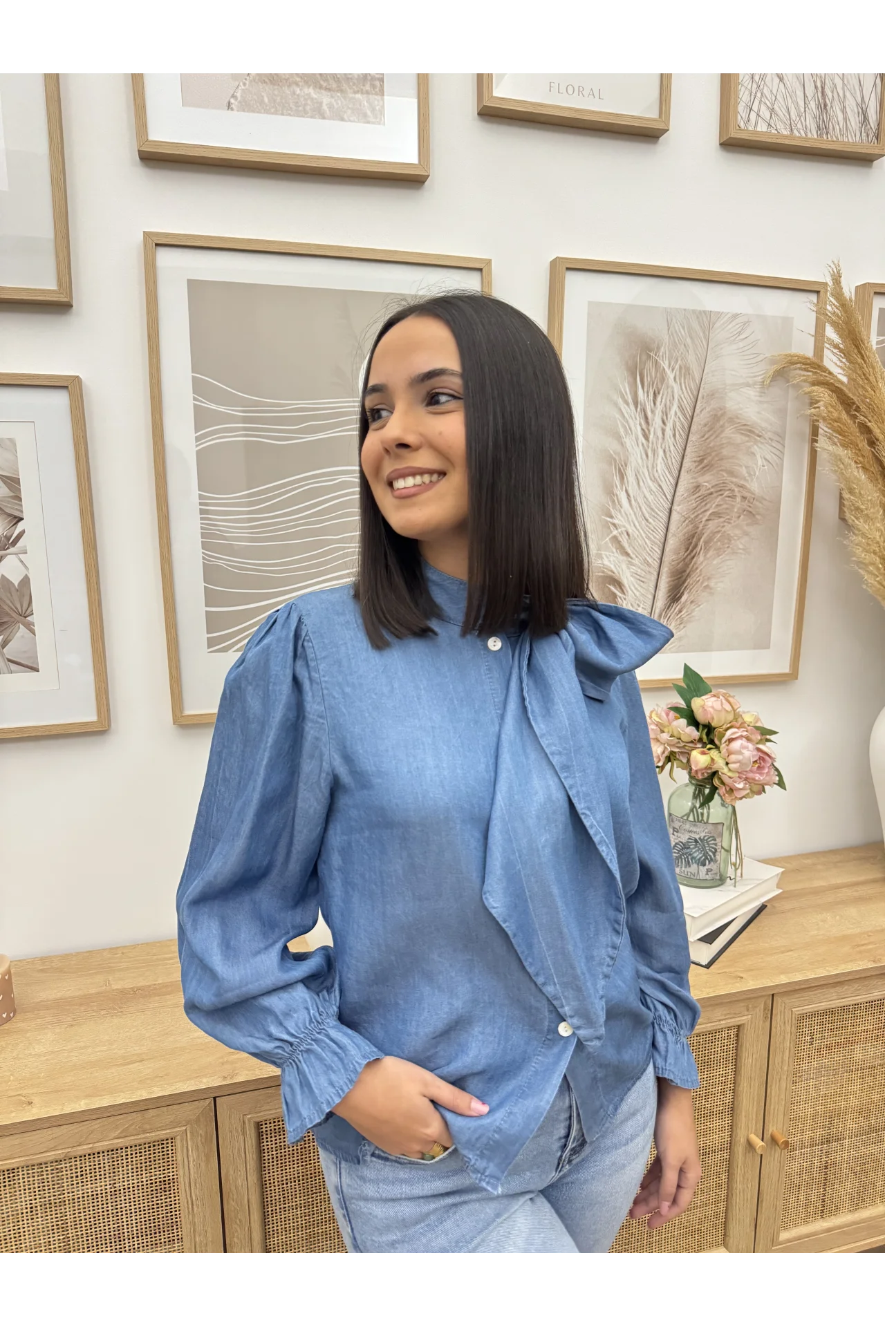 Camisa tejido fluido efecto denim. Cierre con botones y lazada al cuello.