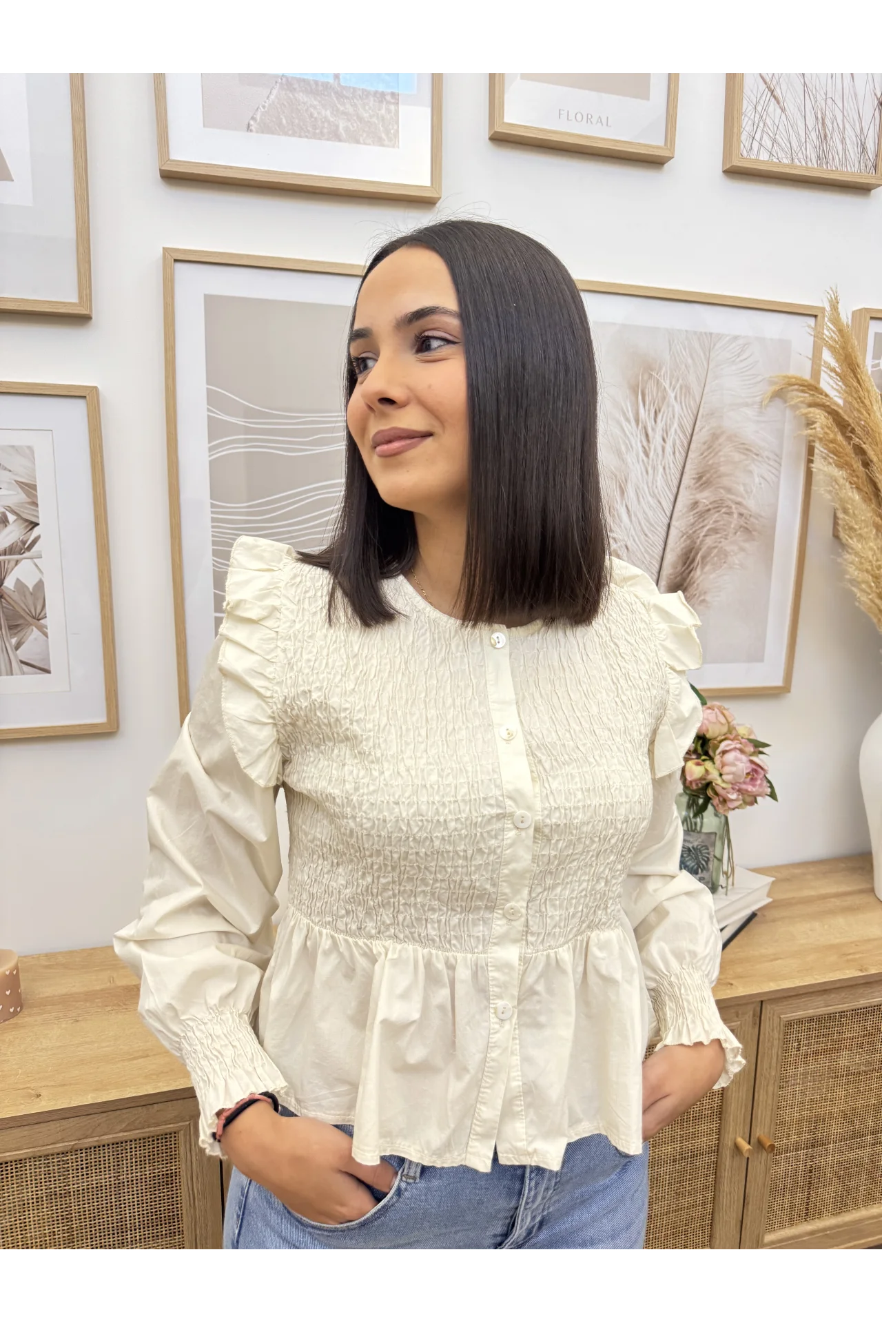 Camisa cropped con nido de abeja en la zona del pecho y mao acabado en volante. Cierre con botones y manga abullonada.