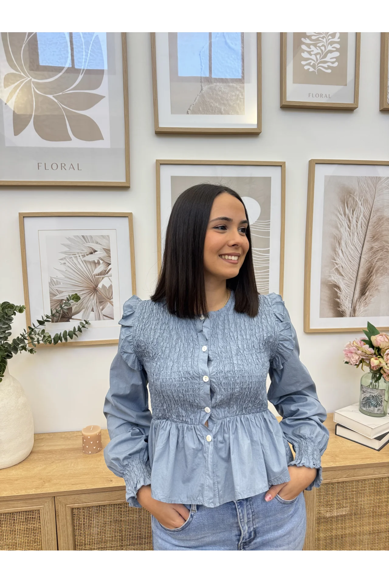 Camisa cropped con nido de abeja en la zona del pecho y mao acabado en volante. Cierre con botones y manga abullonada.