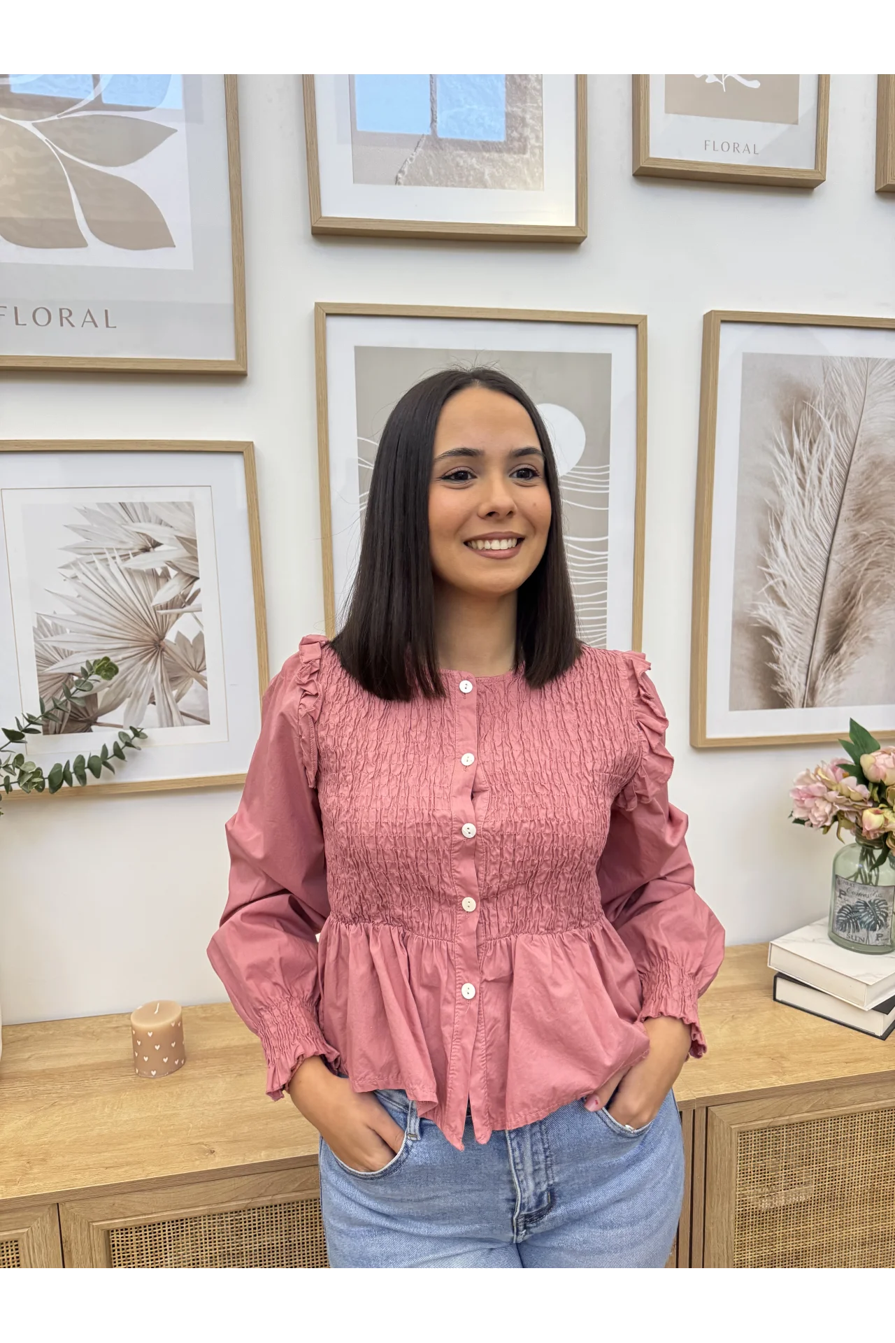Camisa cropped con nido de abeja en la zona del pecho y mao acabado en volante. Cierre con botones y manga abullonada.