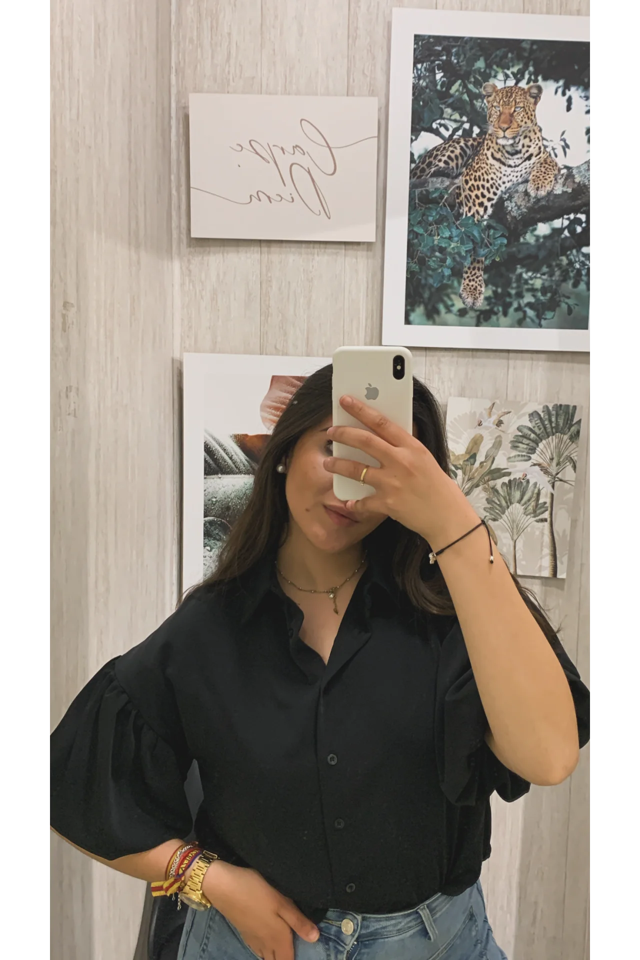 Camisa de tejido fluido y manga corta tipo globo. Cierre con botones y cuello con solapa.