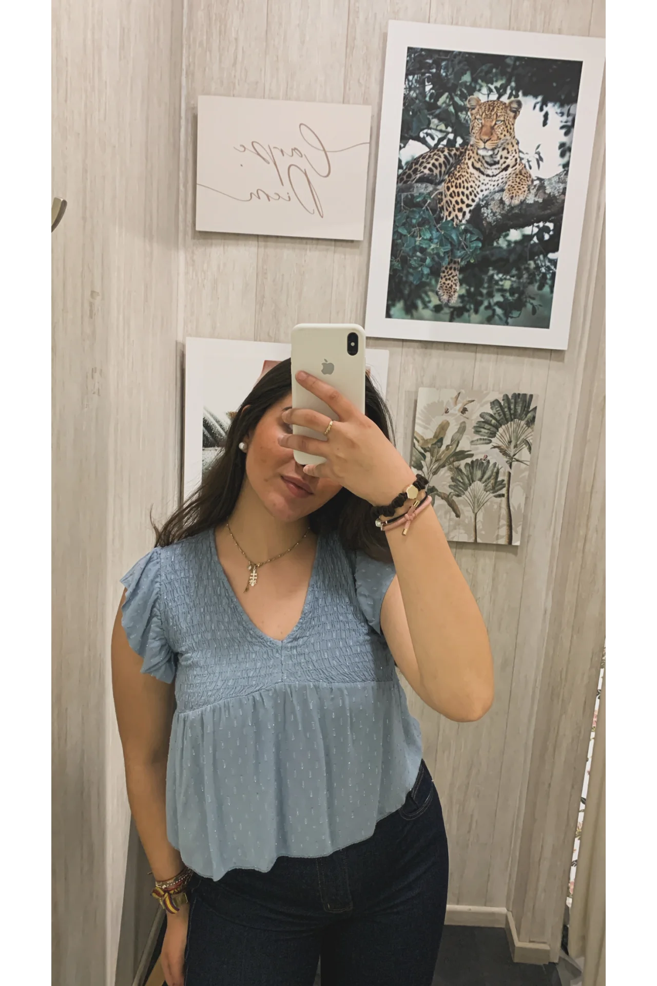 Camisa cropped con detalle de nido de abeja en la parte delantera. Escote de pico y mangas a la sisa.