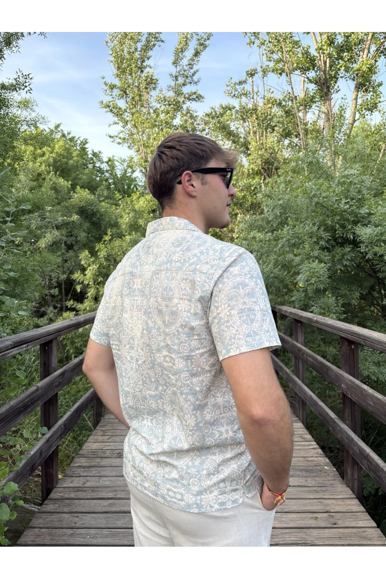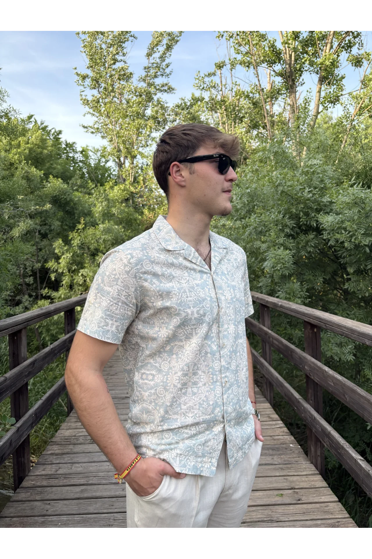 Camisa manga corta con estampado de cachemir y cuello de solapa.