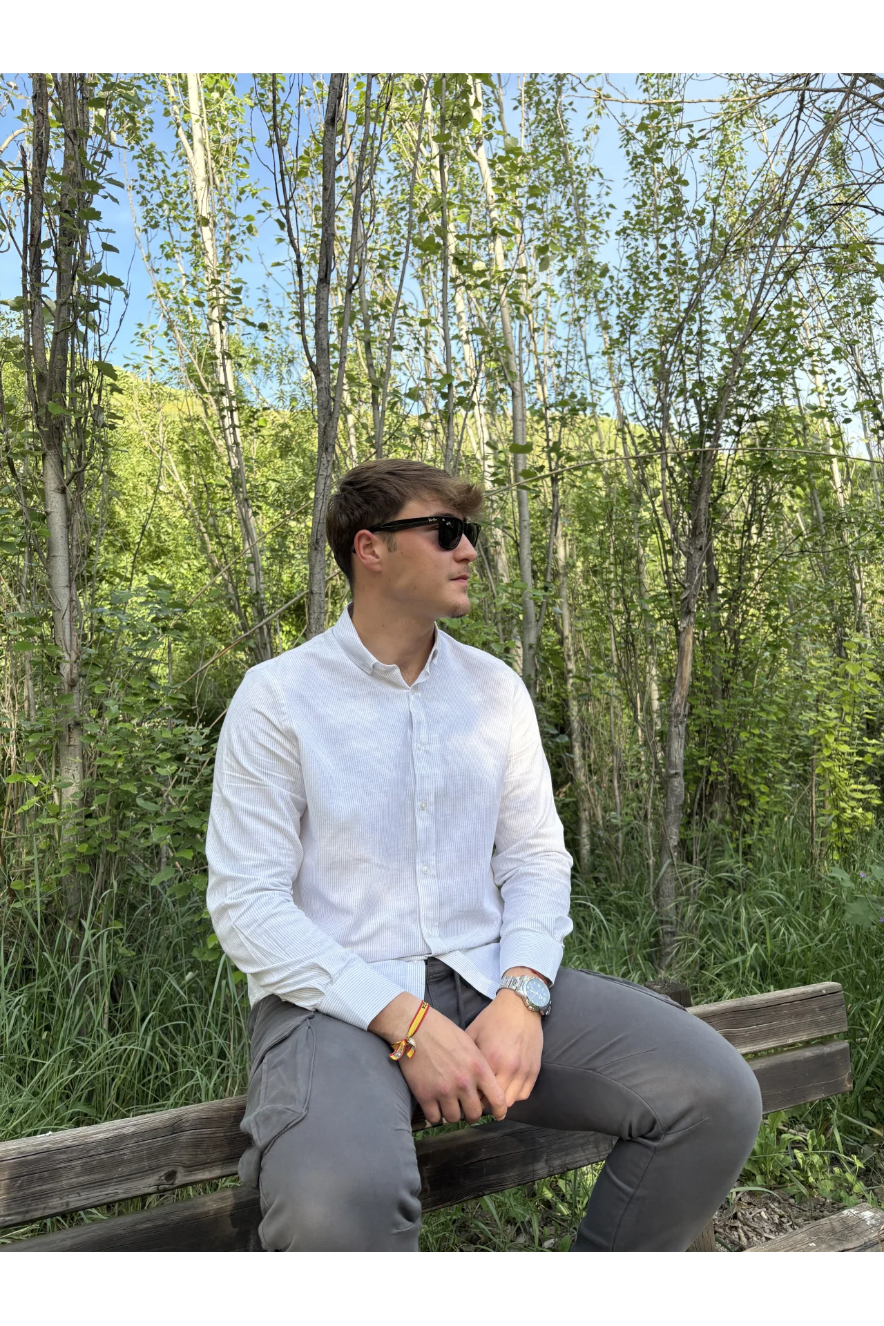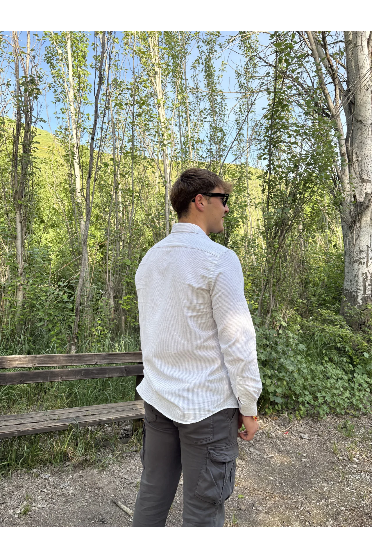 Camisa de tejido de algodón con rayas finas en tono gris. Cuello mao y manga larga.