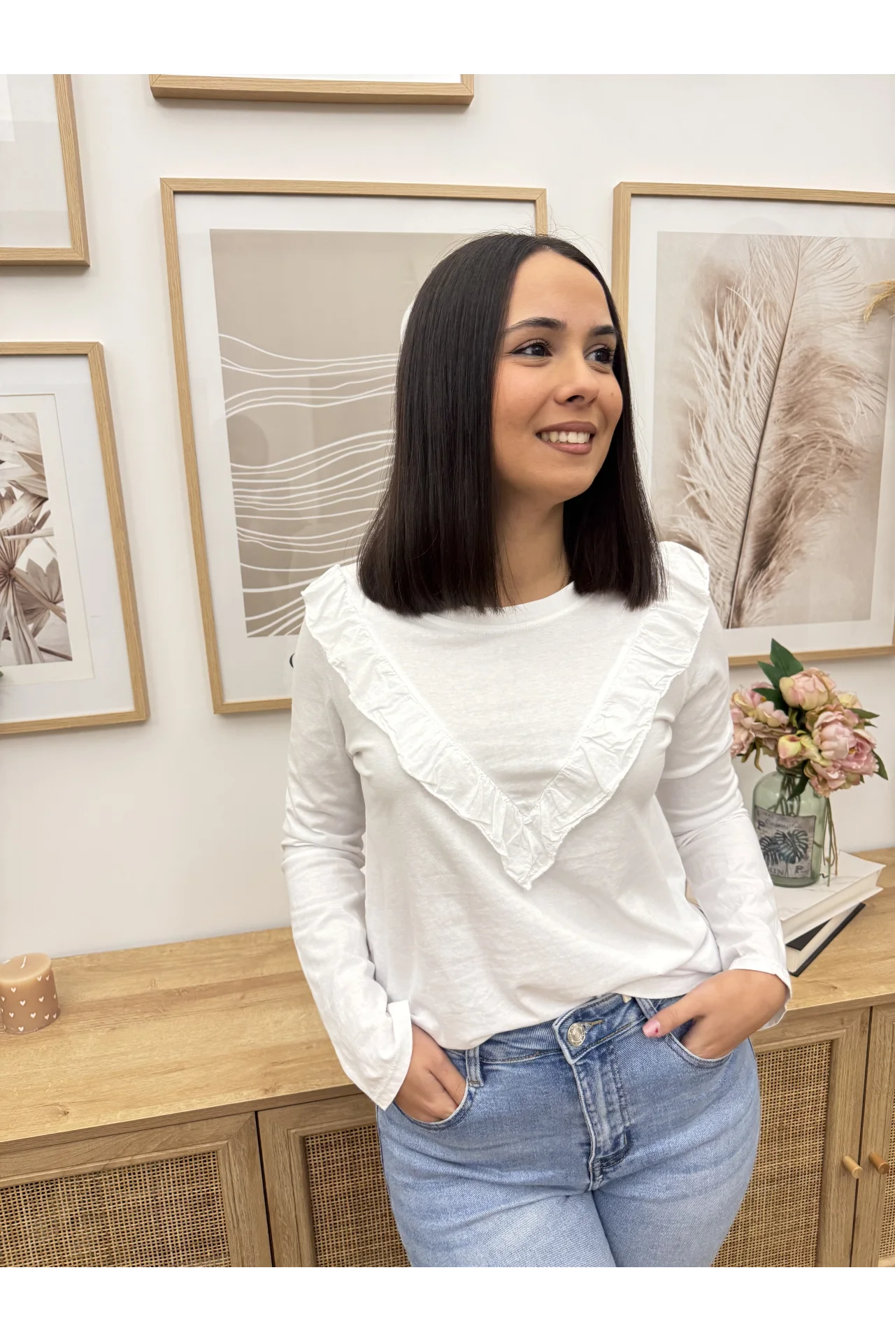 Camiseta básica con detalle de volante en la parte superior.