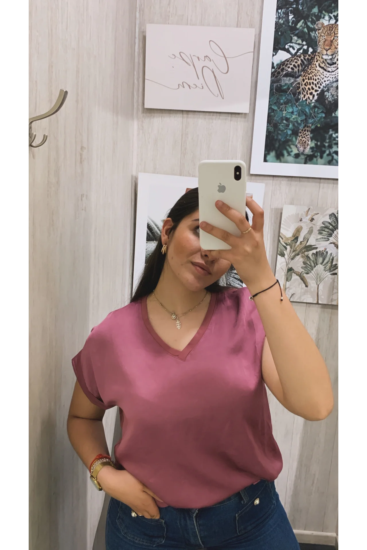 Camiseta de raso con tejido de punto en la parte trasera, con manga corta y cuello de pico.