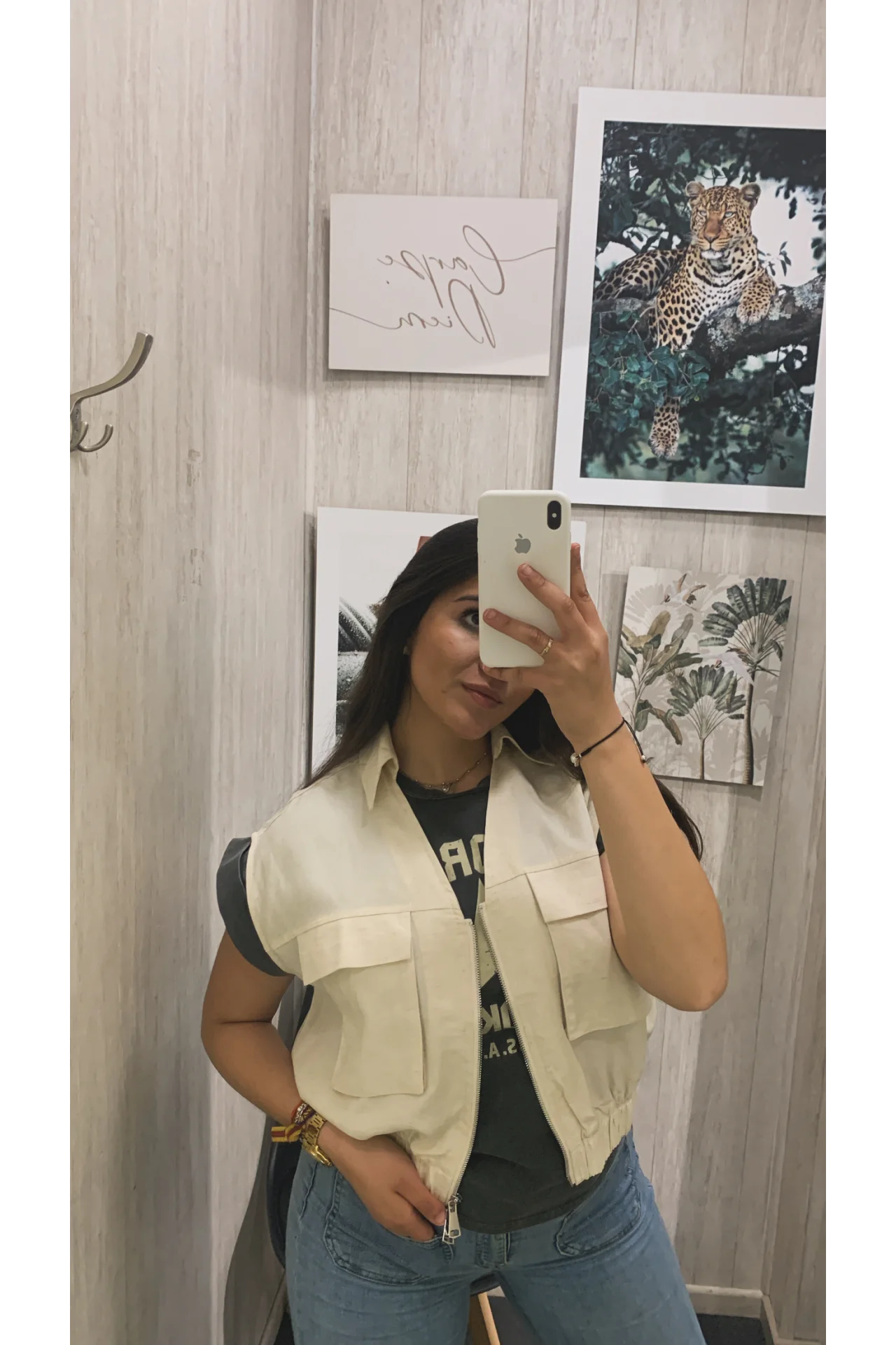 Chaleco tipo bomber de tejido de lino. Cierre con cremallera y mangas a la sisa. Bolsillos plastrón delanteros.