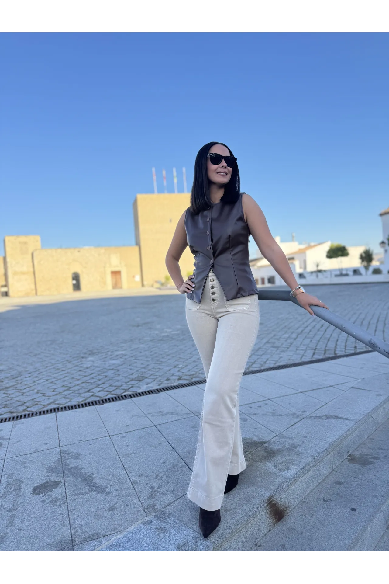 Chaleco básico tipo sastre de polipiel. Cierre con botones en la parte delantera.