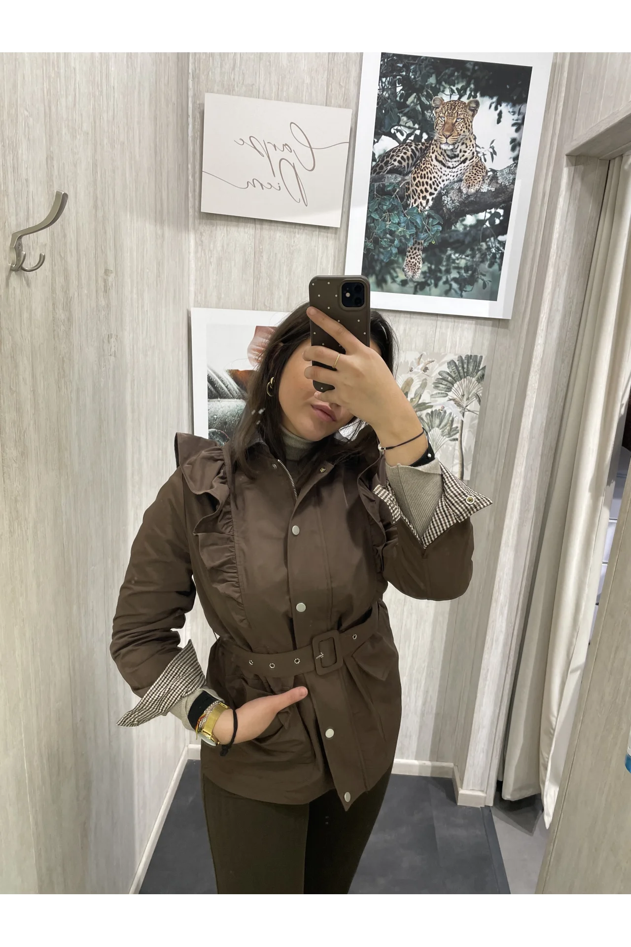 Chaqueta de tejido de nylon. Cuello con solapa de polipiel. Cierre con cremallera y botón a presión. Detalle de volante desde el hombro.