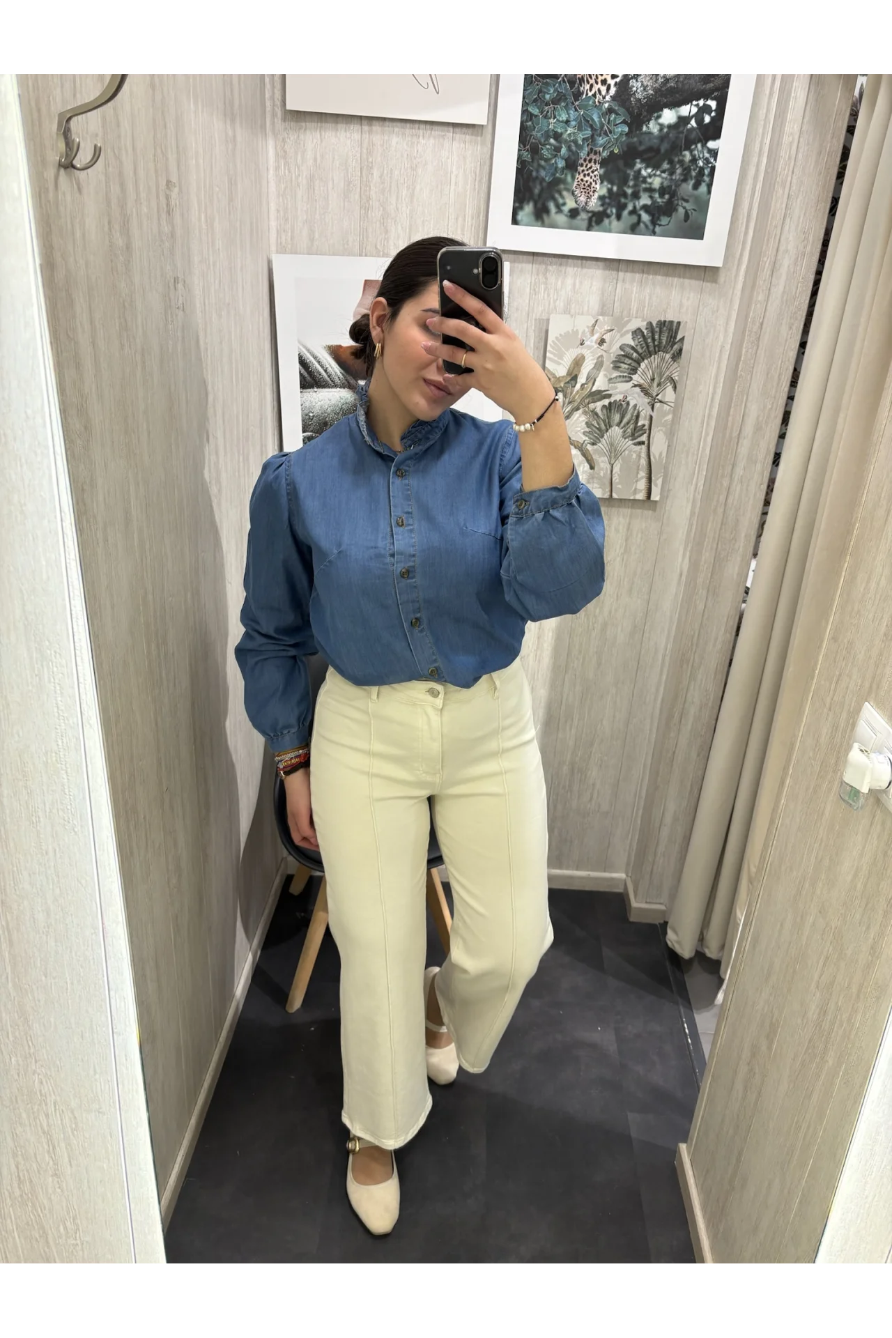 Jeans wide leg con detalle de costura en la parte delantera. Cierre con cremallera y botón. Cinco bolsillos.