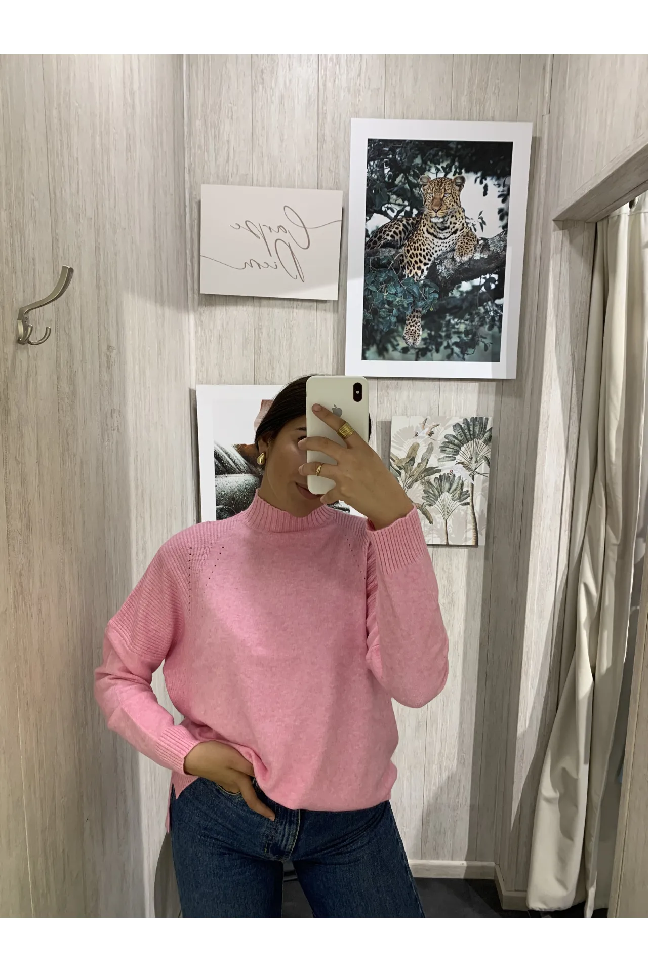 Jersey básico con detalle de canalé y perforado en las mangas. Cuello cisne y abertura en los laterales.