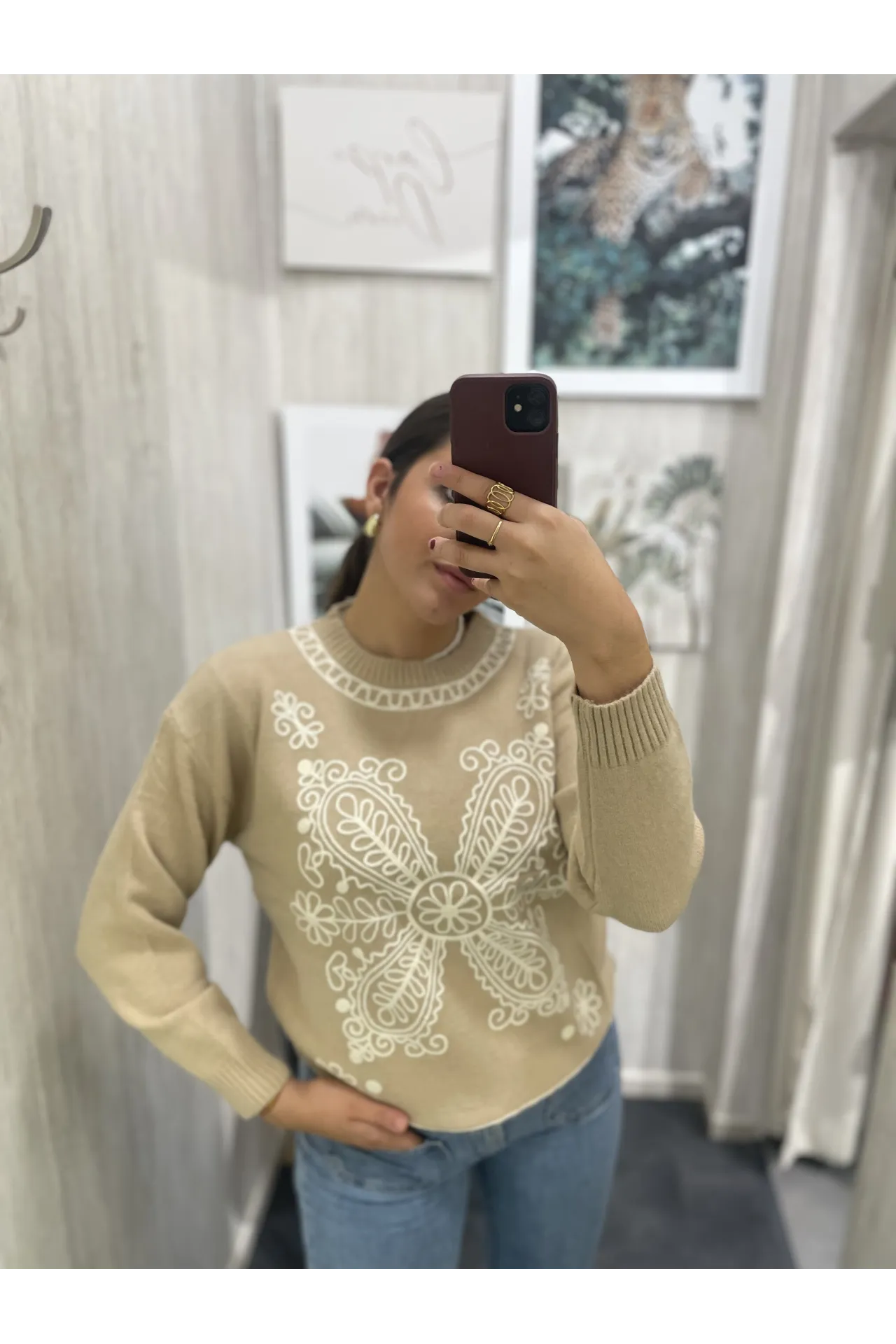 Jersey básico con bordados de flores. Con cuello redondo y manga larga.