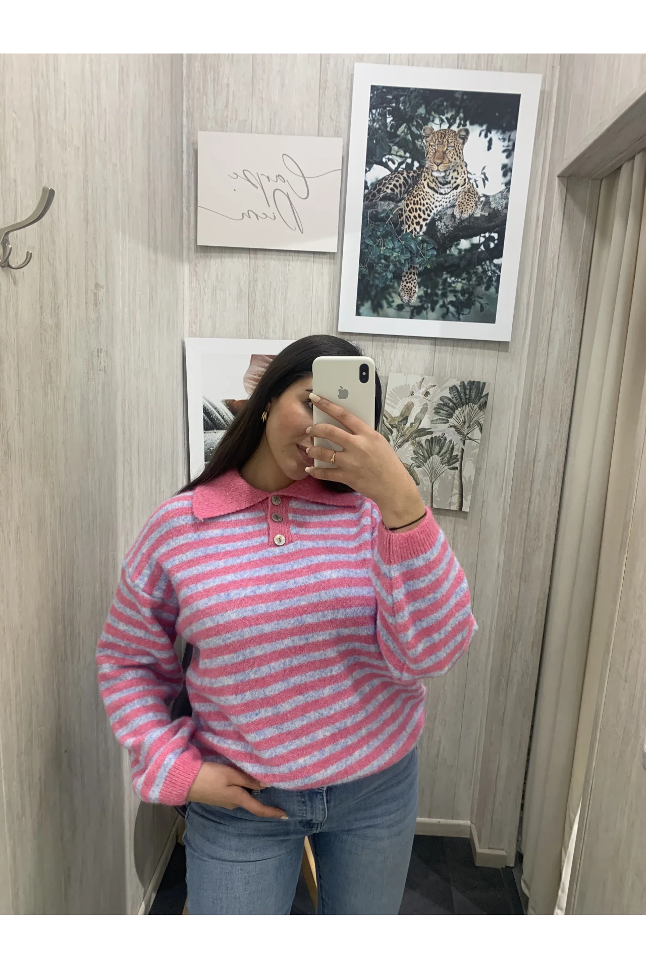 Jersey de tejido de lana con rayas finas. Cuello tipo polo con cierre de botones.