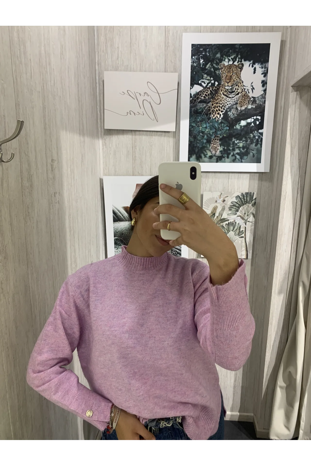 Jersey básico mezclado con cuello cisne y manga larga. Abertura en los laterales.