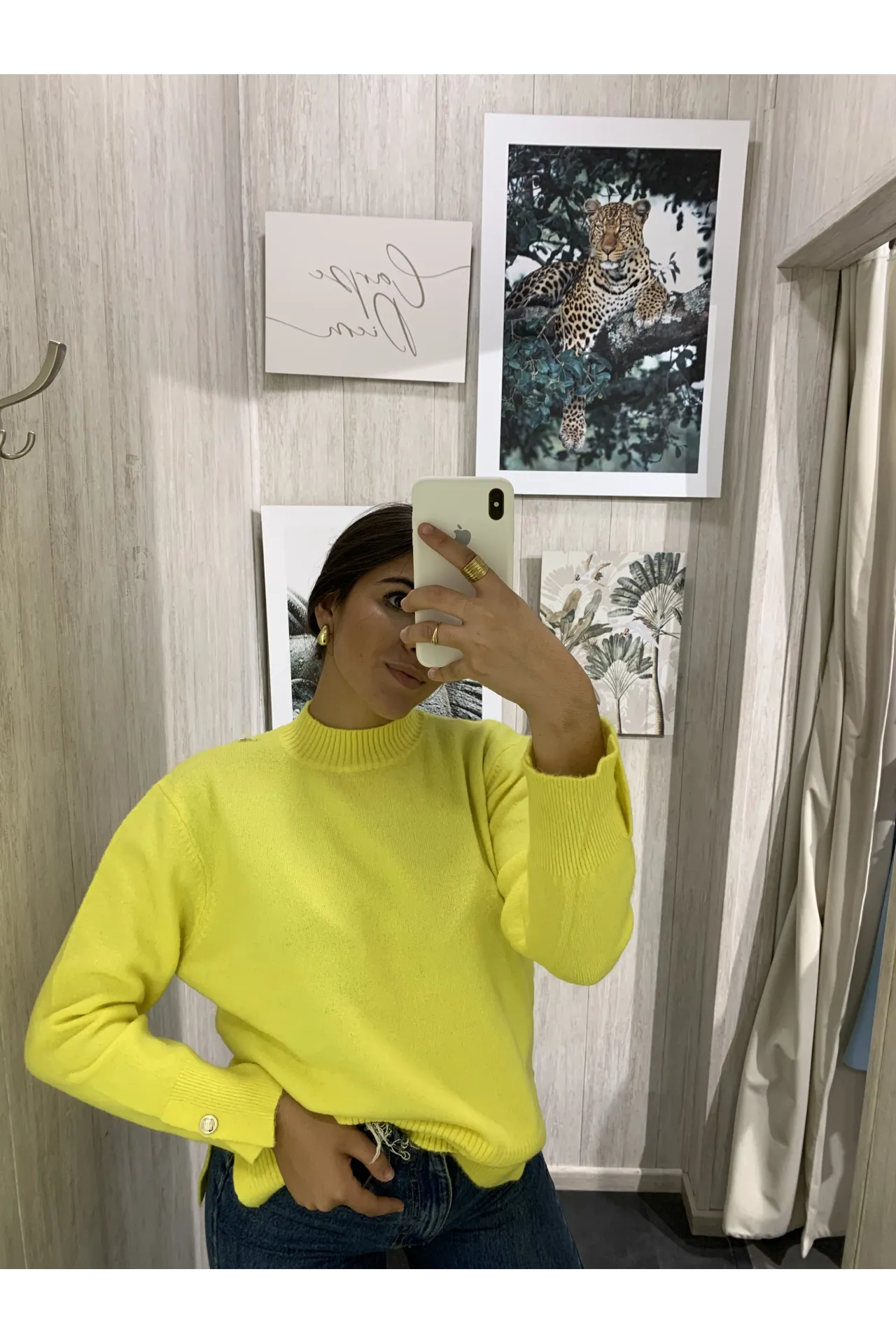 Jersey básico mezclado con cuello cisne y manga larga. Abertura en los laterales.
