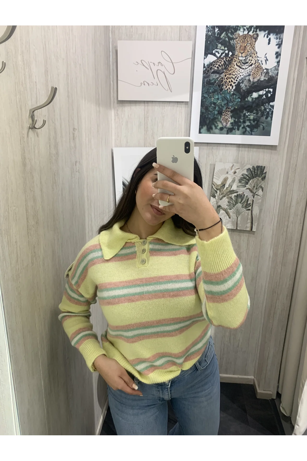 Jersey de tejido de lana con rayas combinadas. Escote tipo polo y cierre con botones.