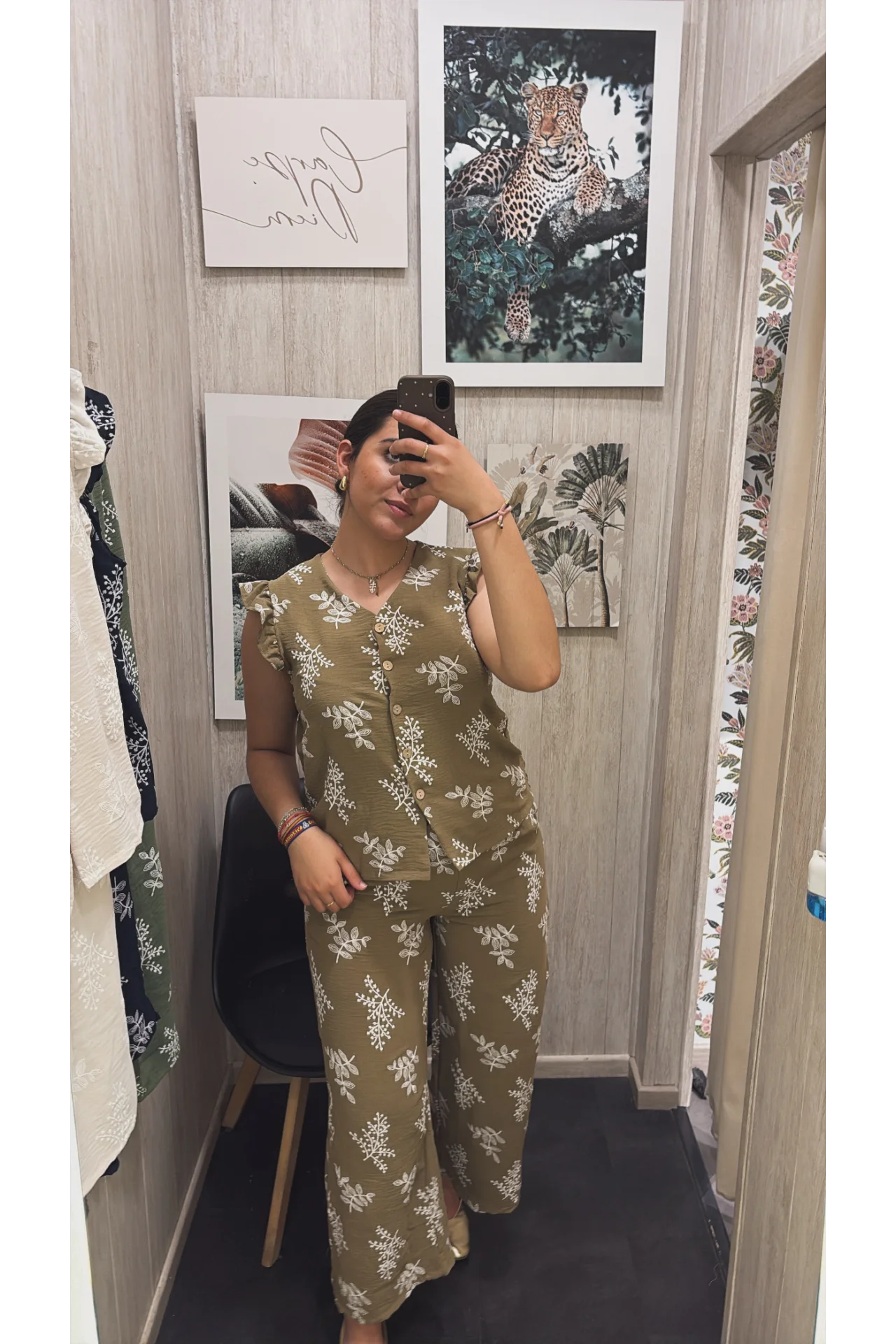 Conjunto de tejido fluido. Camisa con mangas a la sisa y escote de pico con detalle de botones. Pantalón ancho con goma en la cintura.