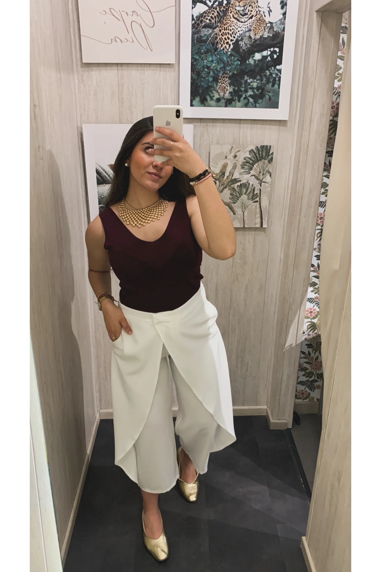 Pantalón de tipo globo con detalle de capa en la parte delantera. Cierre con botón y goma en la parte trasera.