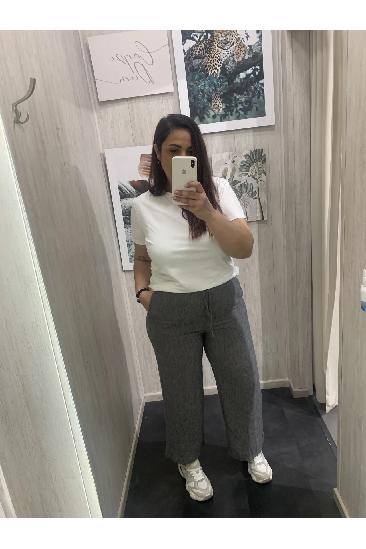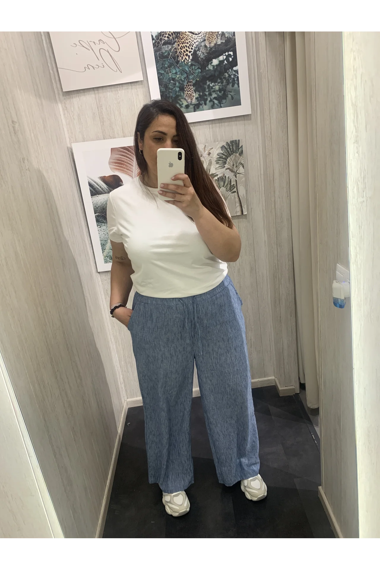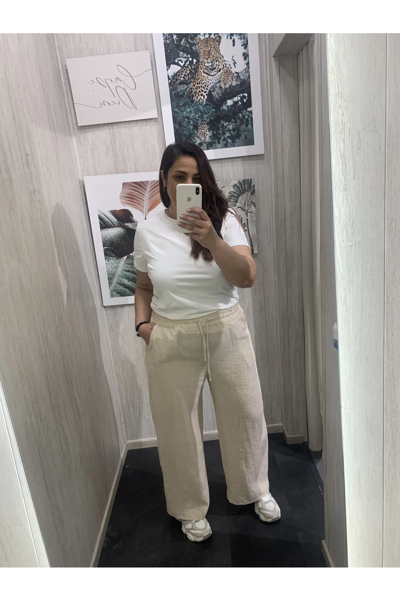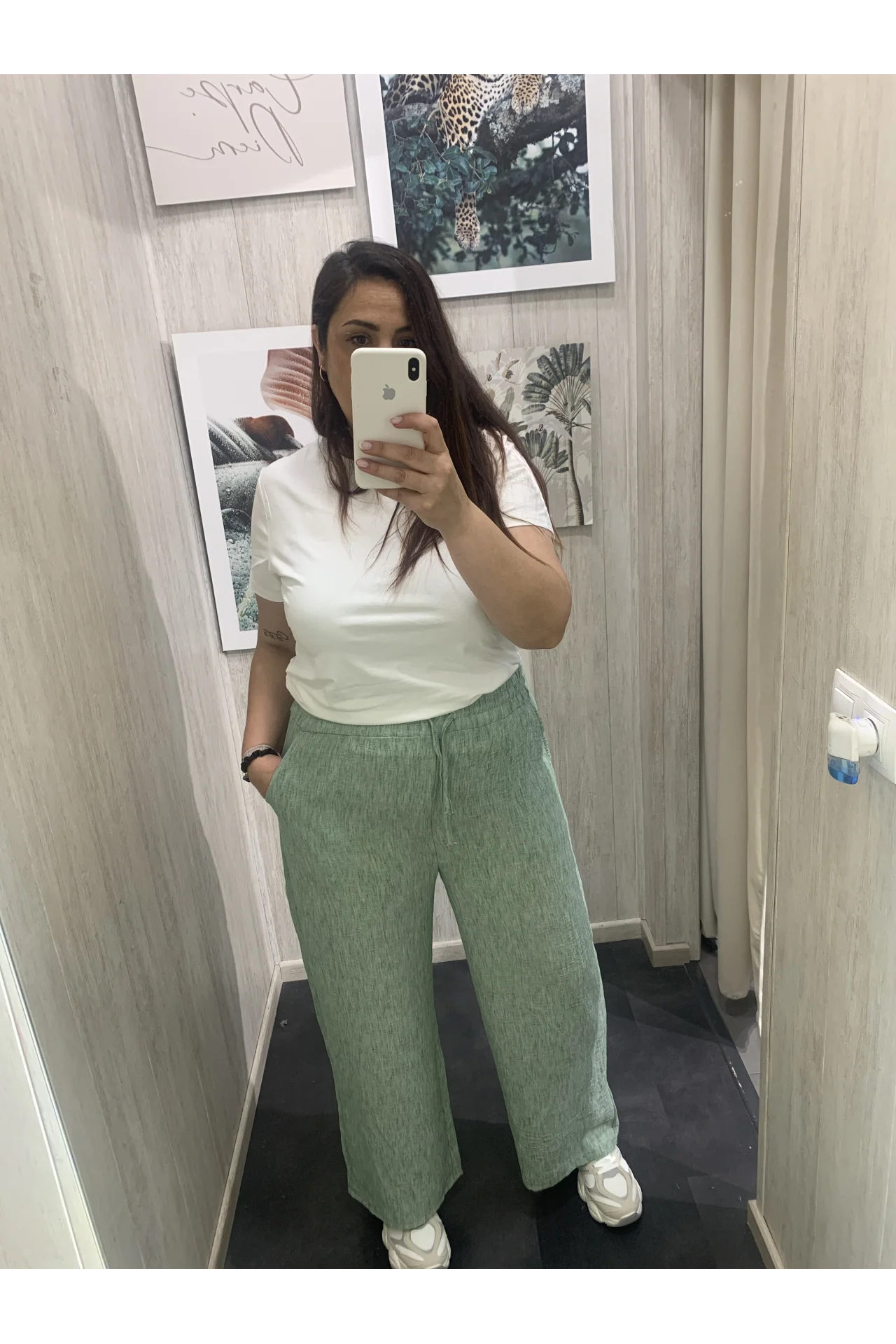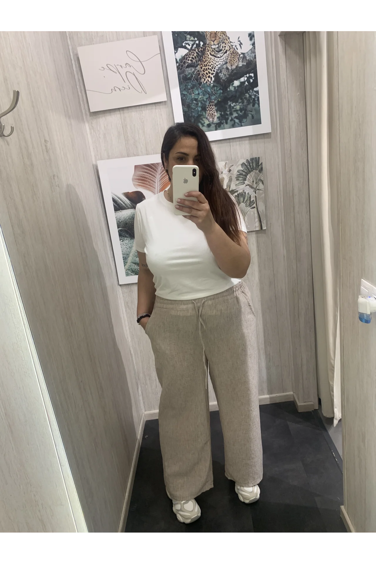 Pantalón fluido efecto lino, con goma y cordón en la cintura.