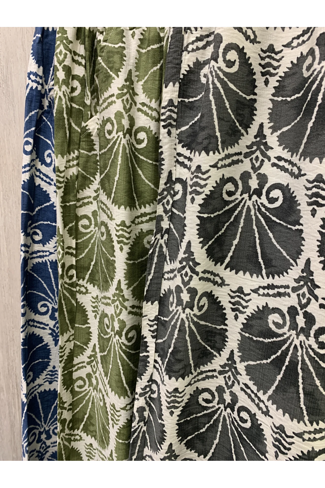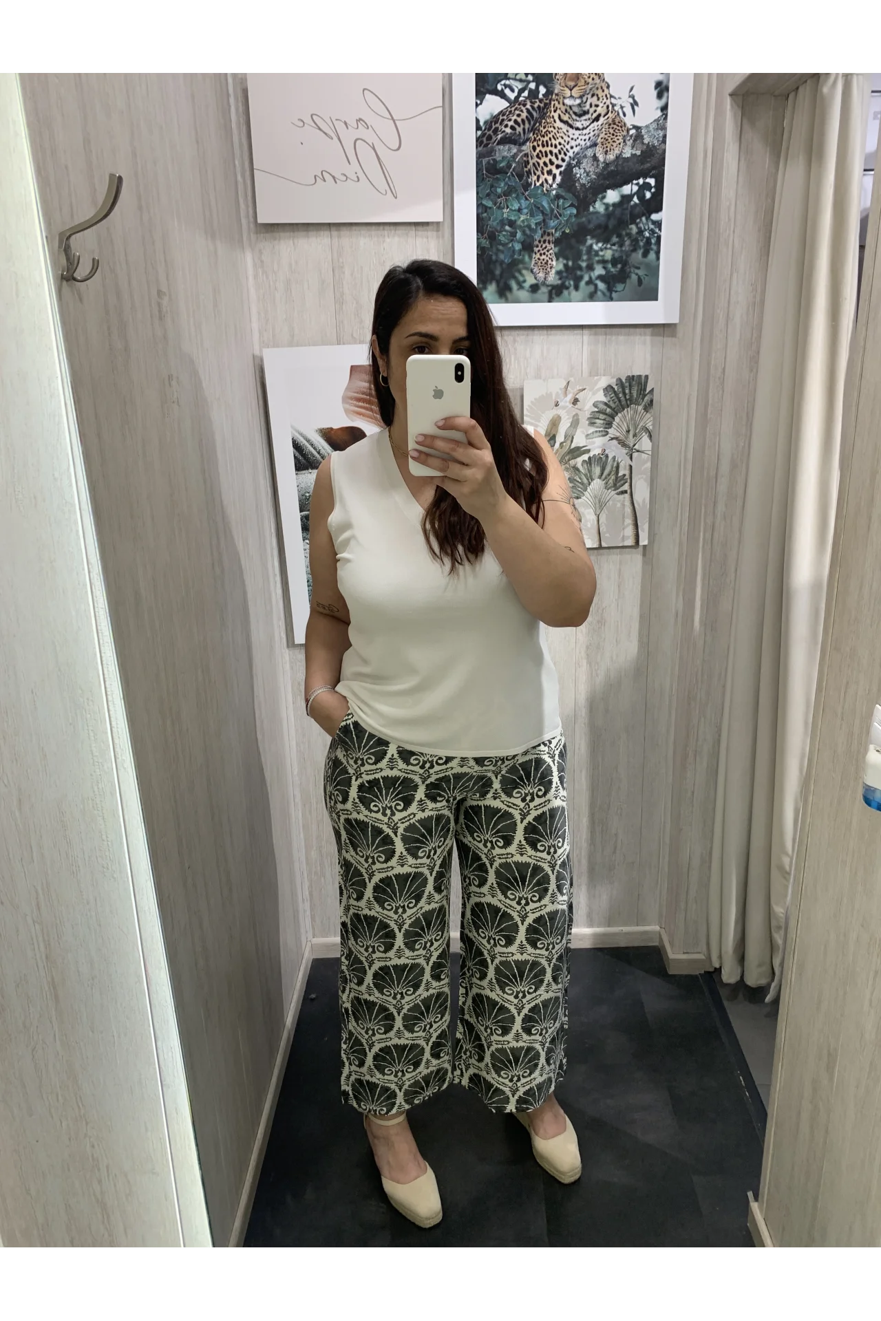 Pantalón fluido de pierna ancha con estamapdo retro. Cintura de goma y bolsillos laterales.