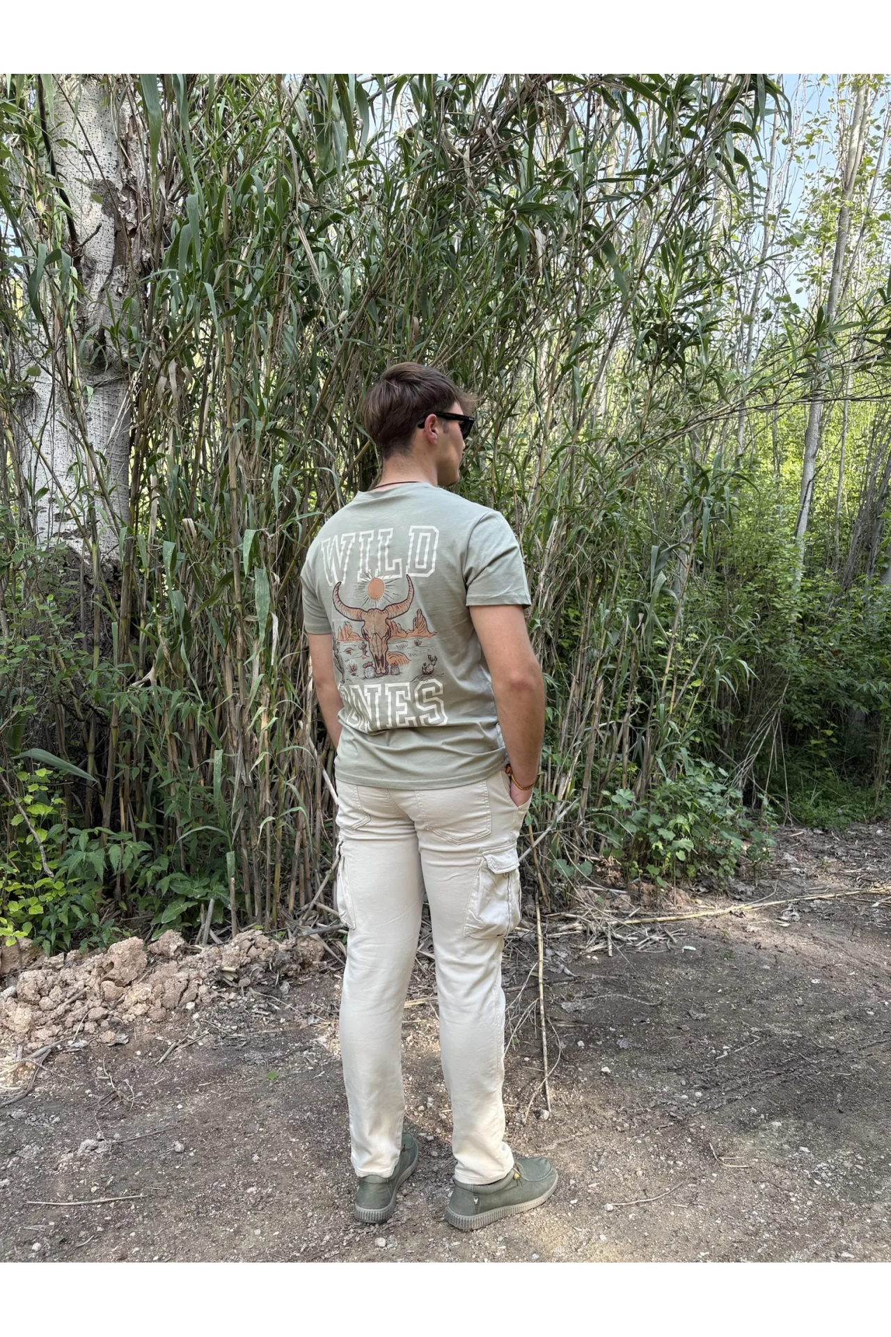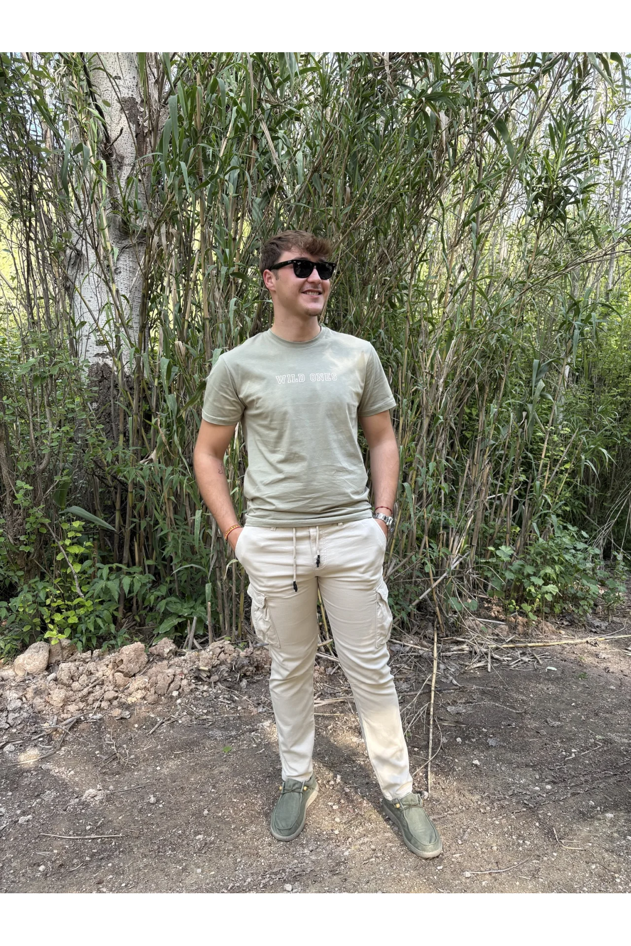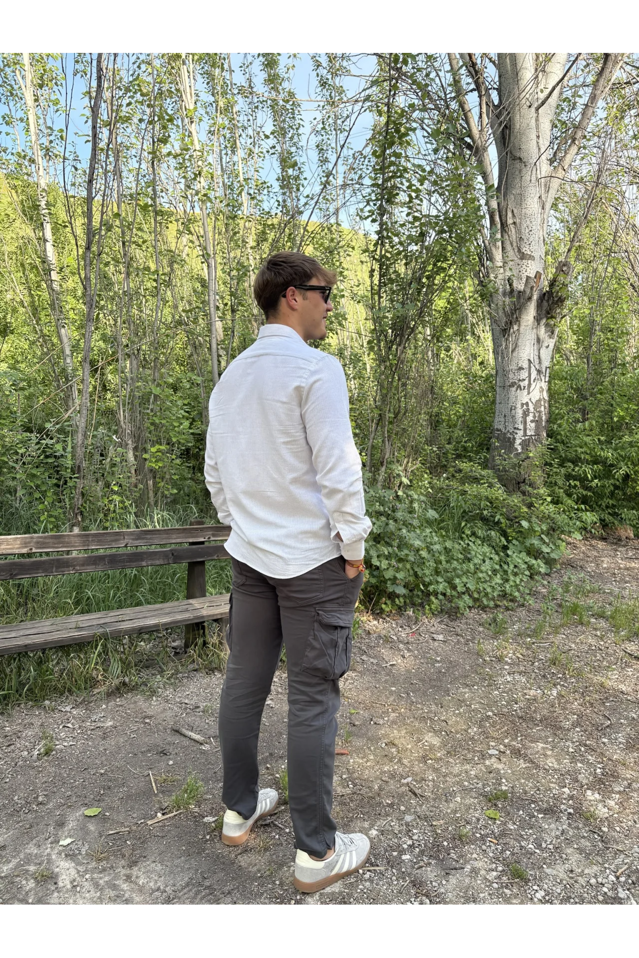 Pantalón cargo, con goma en la cintura y cordón ajustable, con bolsillos en los laterales.