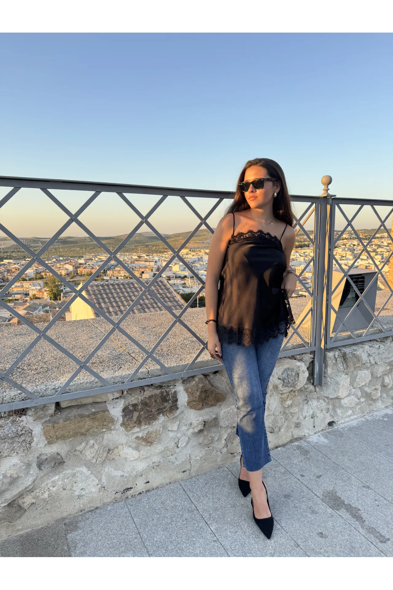 Top lencero de escote pico y tirantes finos. Detalle de aplicación de encaje a tono. Bajo asimétrico.