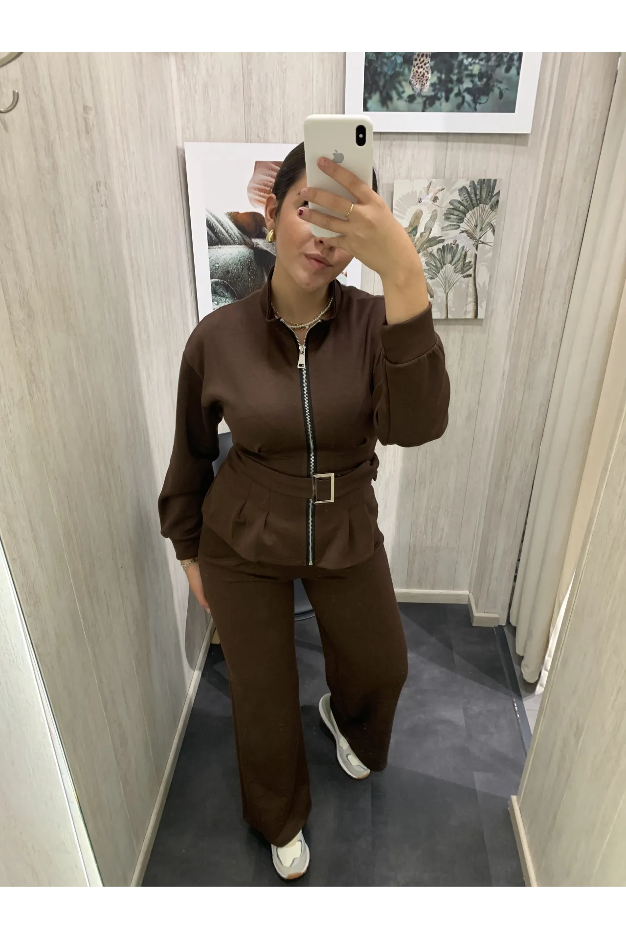 Conjunto chandal de tacto suave. Sudadera con pinzas y cinturón en la cintura. Pantalón de pierna ancha y goma en la cintura.