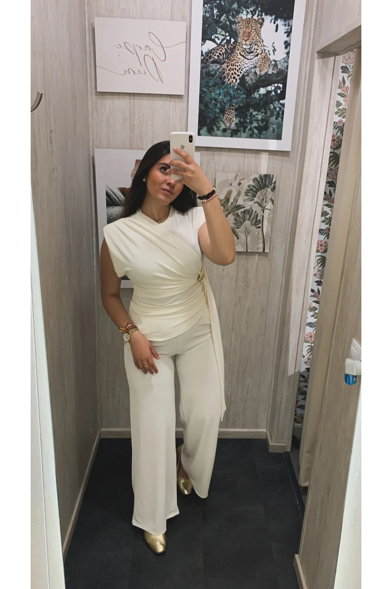 Conjunto de pantalón con goma en la cintura y pierna ancha y blusa con manga a la sisa y hombreras, con detalle de cruzado con broche dorado.