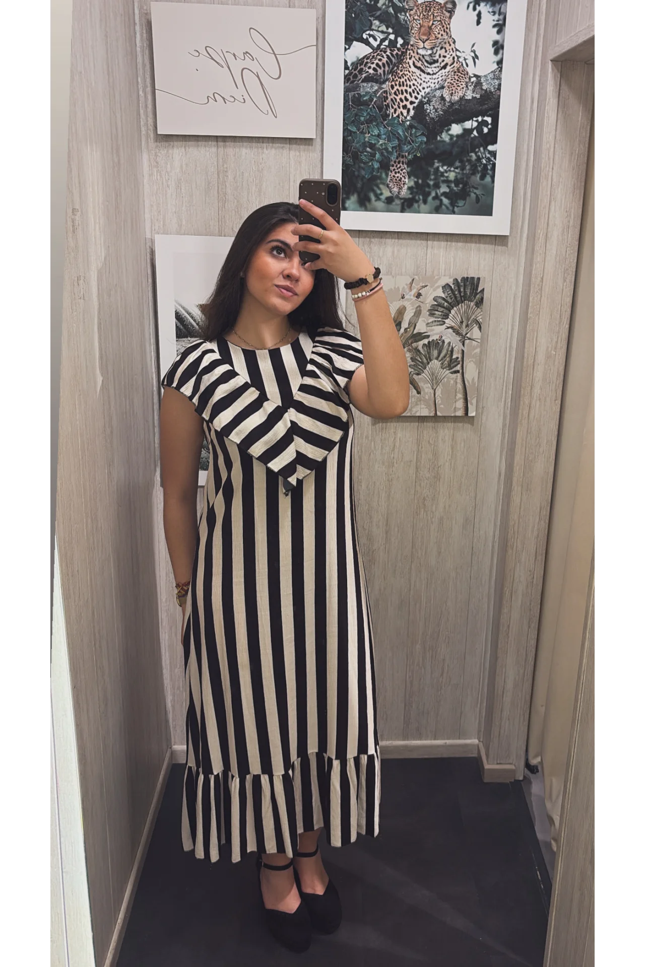 Vestido con forma ebase, con forma de bambúla, con estampado de rayas y detalle de volante en el pecho.