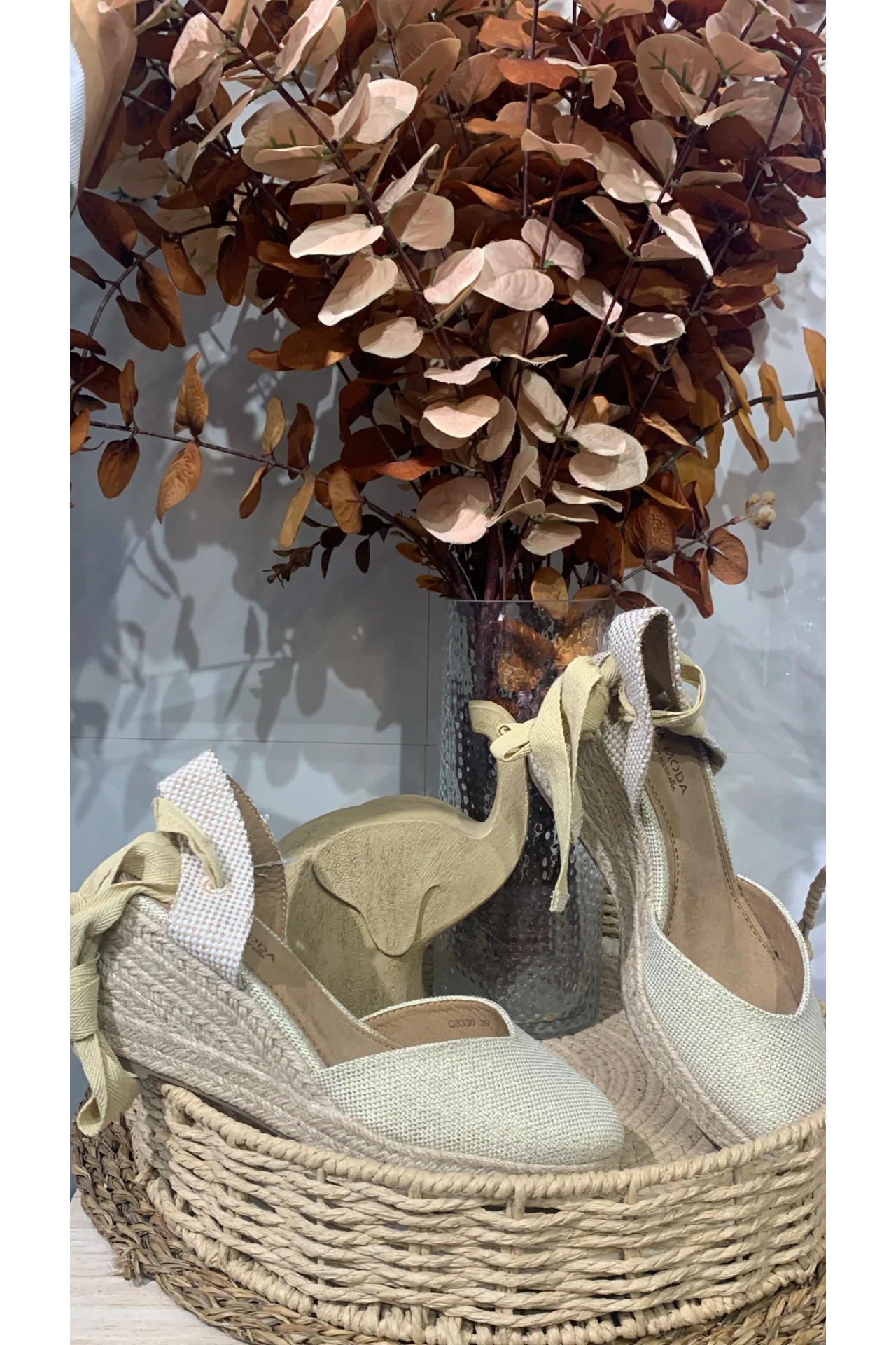 Cuña básica en dorada. Cierre con cuerdas al tobillo. Puntera redonda y y cuña bajita.