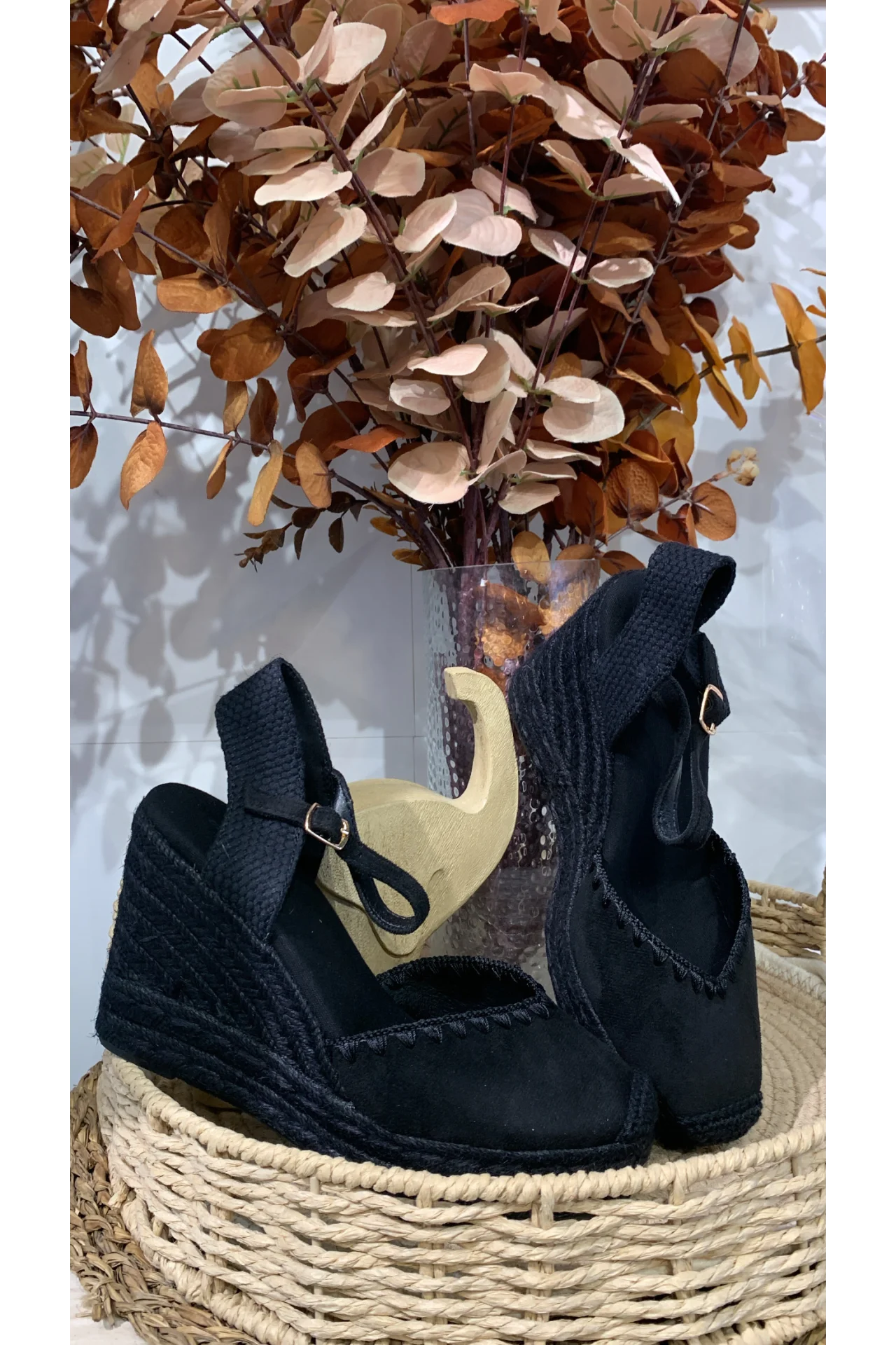 Cuña básica de esparto con plataforma y tejido de ante. Detalle de pespunte y cierre con hebilla al tobilllo.